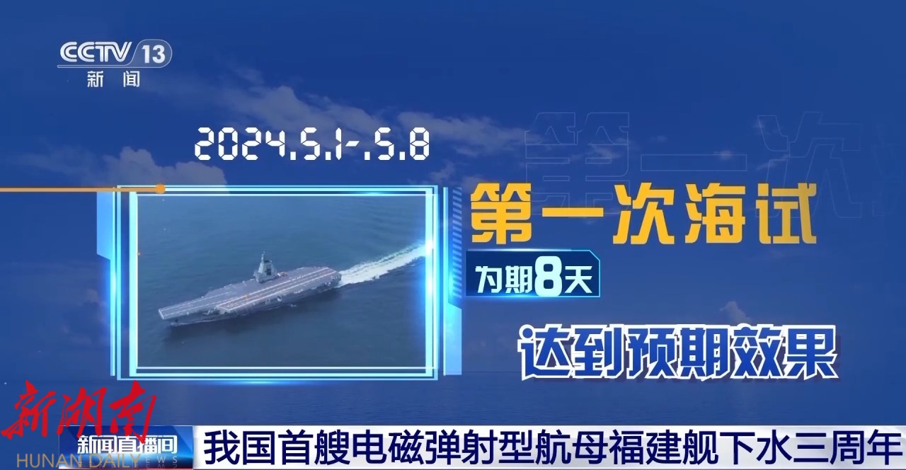 2024年5月1日至5月8日,福建舰进行第一次海试,为期8天。完成动力、电力等系统设备测试,达到预期效果。