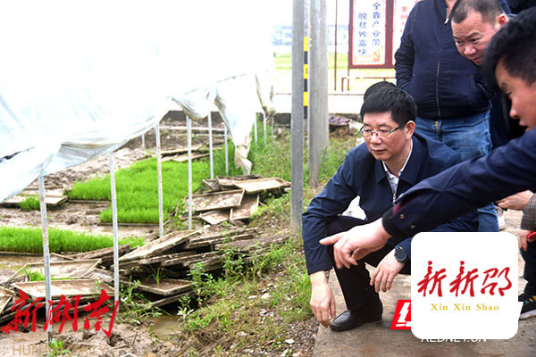 在陈家坊镇双季稻生产区察看集中育秧棚里的秧苗情况。