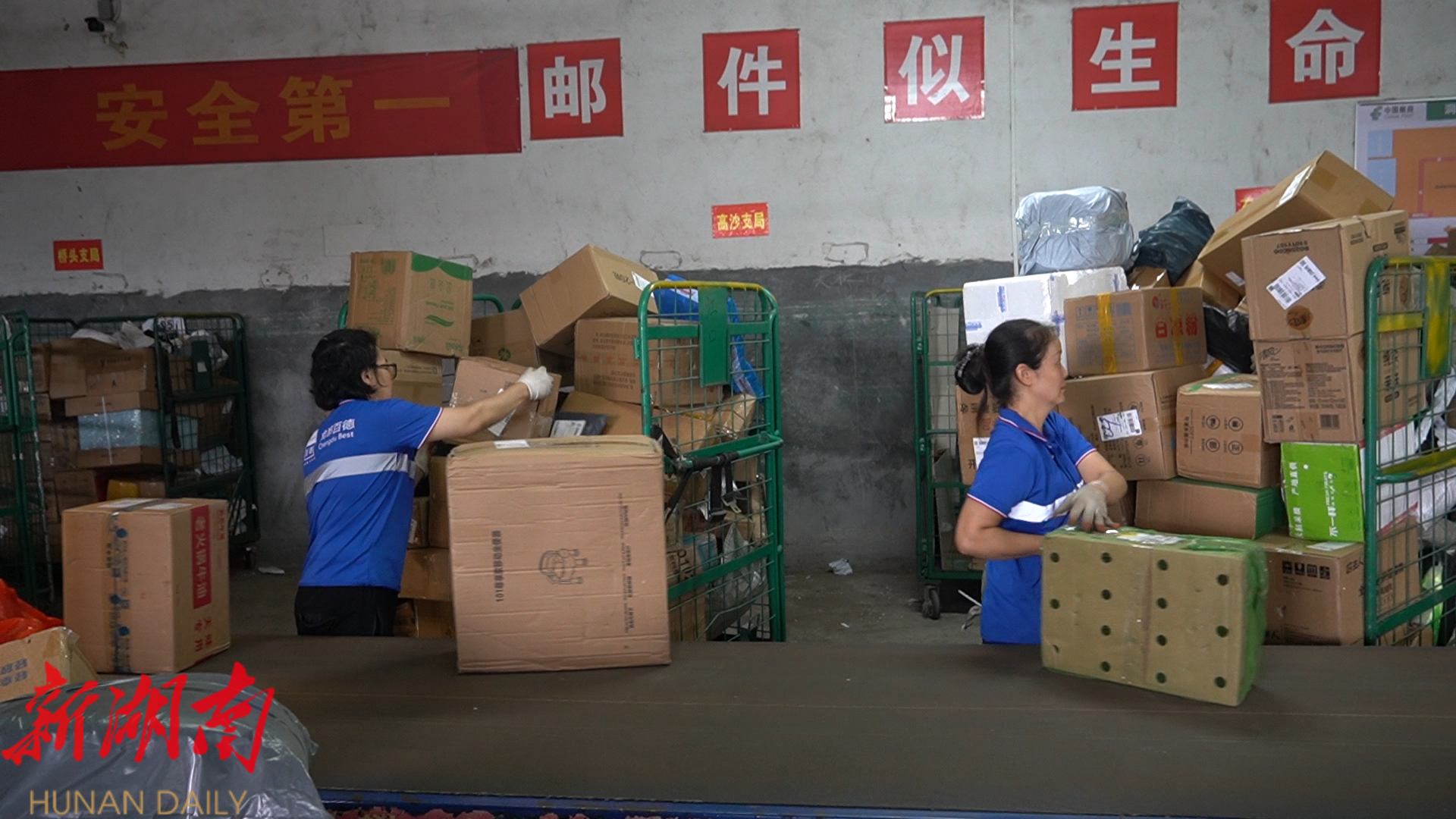 记者在中国邮政洞口县分公司快递分拣中心看到,一辆满载快递的货车缓缓驶入,几十名工作人员立即上前打开车门卸货,有条不紊地进行快递分拣、装车、扫码等工作,上千个包裹源源不断地被投入传送带上,根据大小和重量被精准分流至自动分拣机和人工分拣台。仅一个小时,一个个快递件就“各自归位”,等待配送。