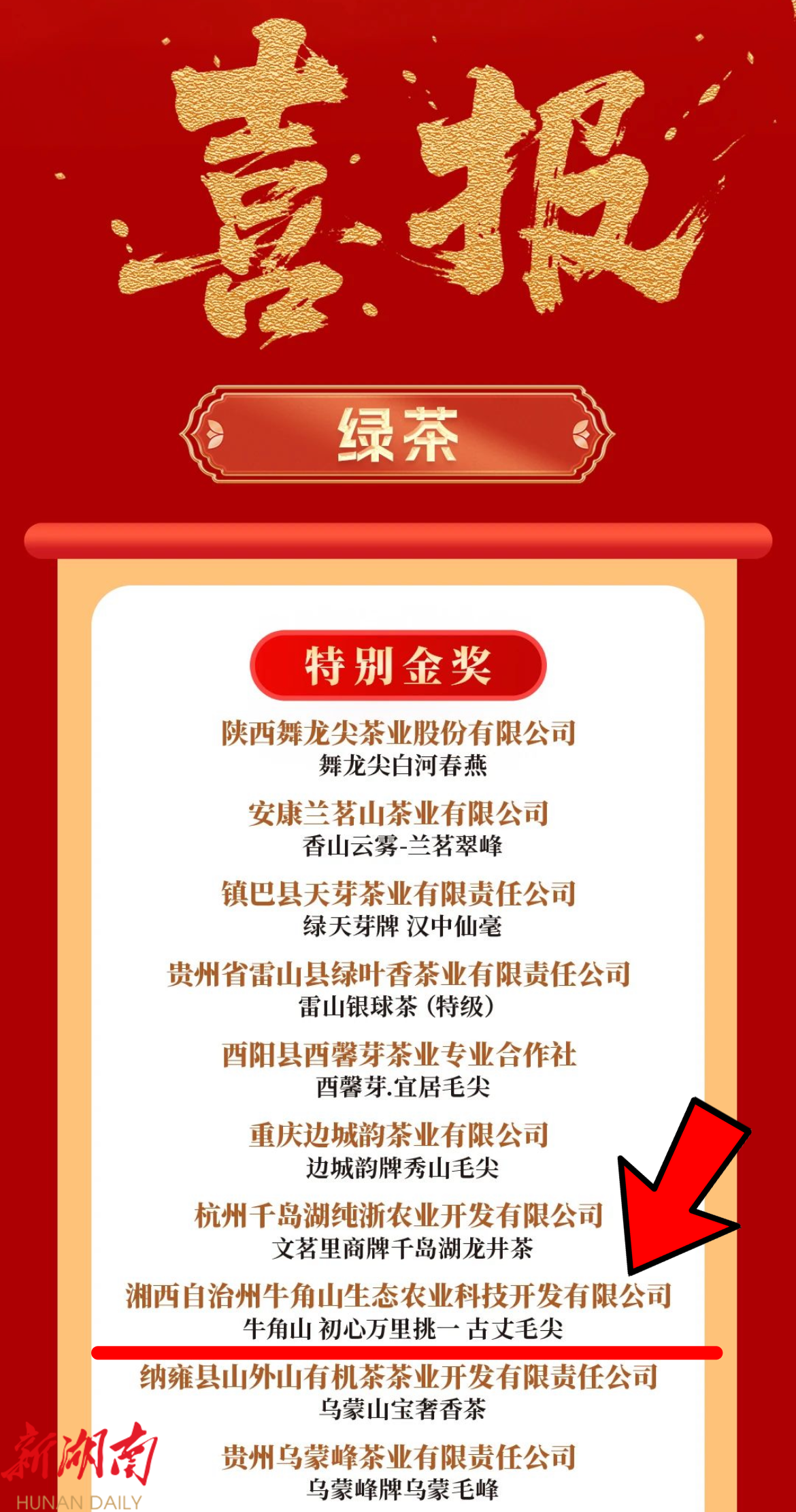 新湖南客户端6月18日讯(通讯员 周湫婧)6月17日,从“中茶杯”第十五届国际鼎承茶王赛(春季赛)传来喜讯,湘西自治州牛角山生态农业科技开发有限公司选送的 “牛角山·初心万里挑一古丈毛尖”,在绿茶组评比中荣获特别金奖,为古丈茶业发展再添亮丽成绩。