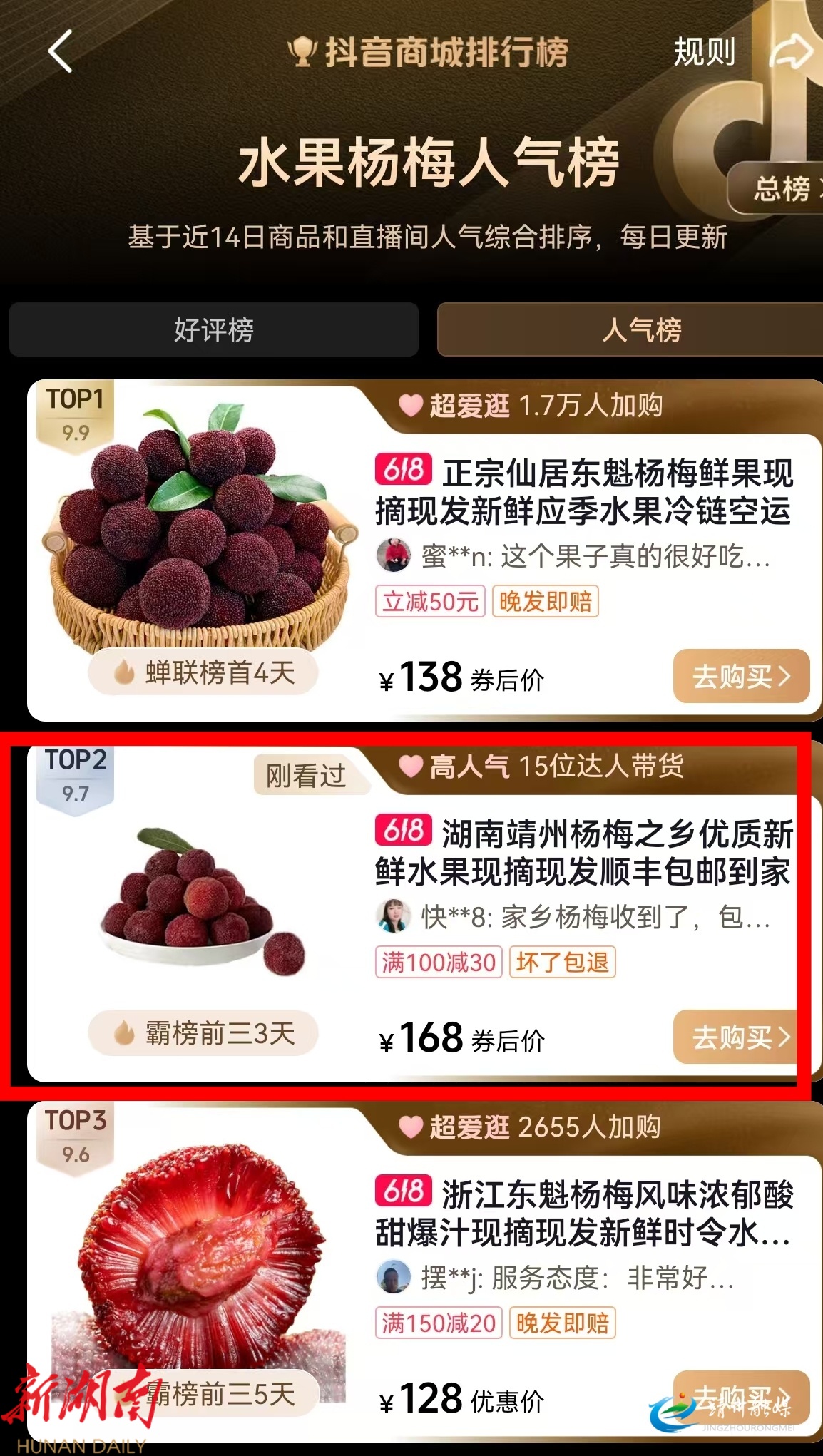 靖州融媒6月18日讯 (记者 周悦伊)6月18日,由共青团靖州苗族侗族自治县委联合靖州生活圈网络科技有限公司开展的“青耕靖州 团团助农”杨梅线上销售活动圆满收官。活动期间,1200余件靖州杨梅鲜果销往全国各地,销售额达20余万元,成功登上抖音商城水果杨梅人气榜单第二名。