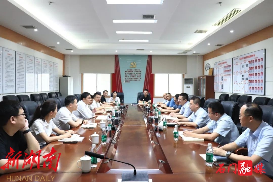 新石门客户端6月19日讯 6月13日 湖南省联合产权交易所有限公司总经理鲍礼彬、省财信资产管理有限公司湘北分公司总经理符国伟、省农村产权交易有限公司常德地区总经理陈德元一行8人莅临石门农商银行,就深化合作进行交流座谈。石门县大地测绘服务有限公司、县农村产权交易平台建设负责人受邀参加会议。