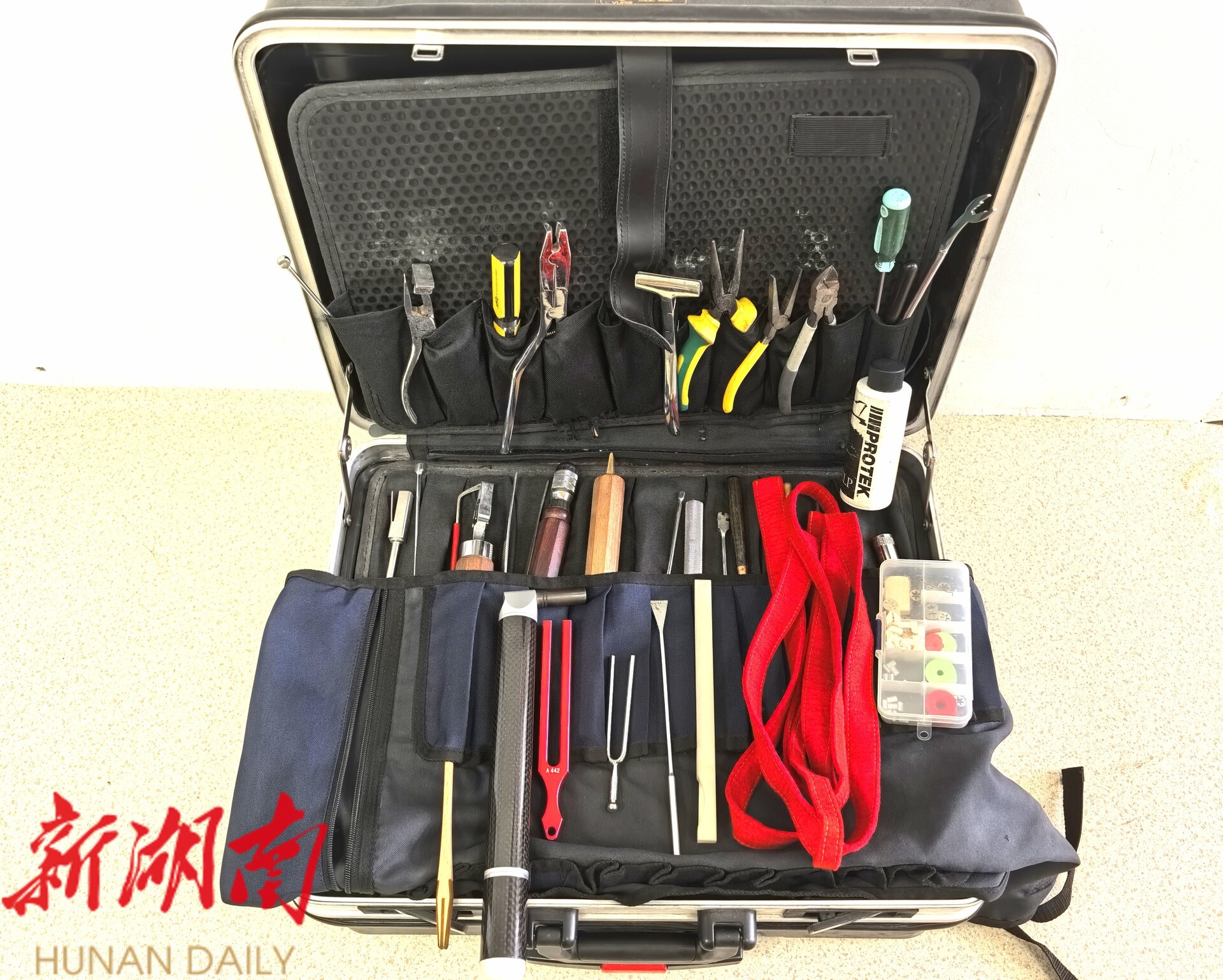 调律工具包,重达几十斤,胡冰经常背着它跑遍长沙等地。