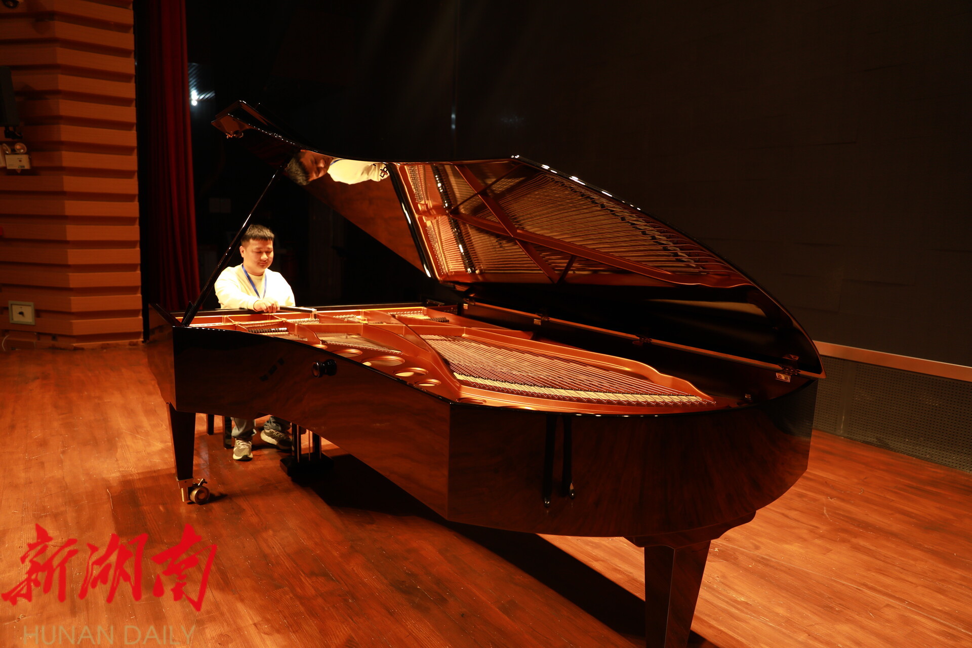 深夜的长沙城,一盏孤灯在雨花区天韵来琴行亮起。胡冰俯身在一架三角钢琴前,耳廓贴近琴弦,指尖轻捻扳手,像一位为钢琴“问诊”的老中医。