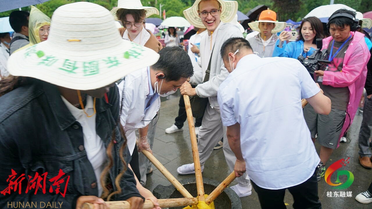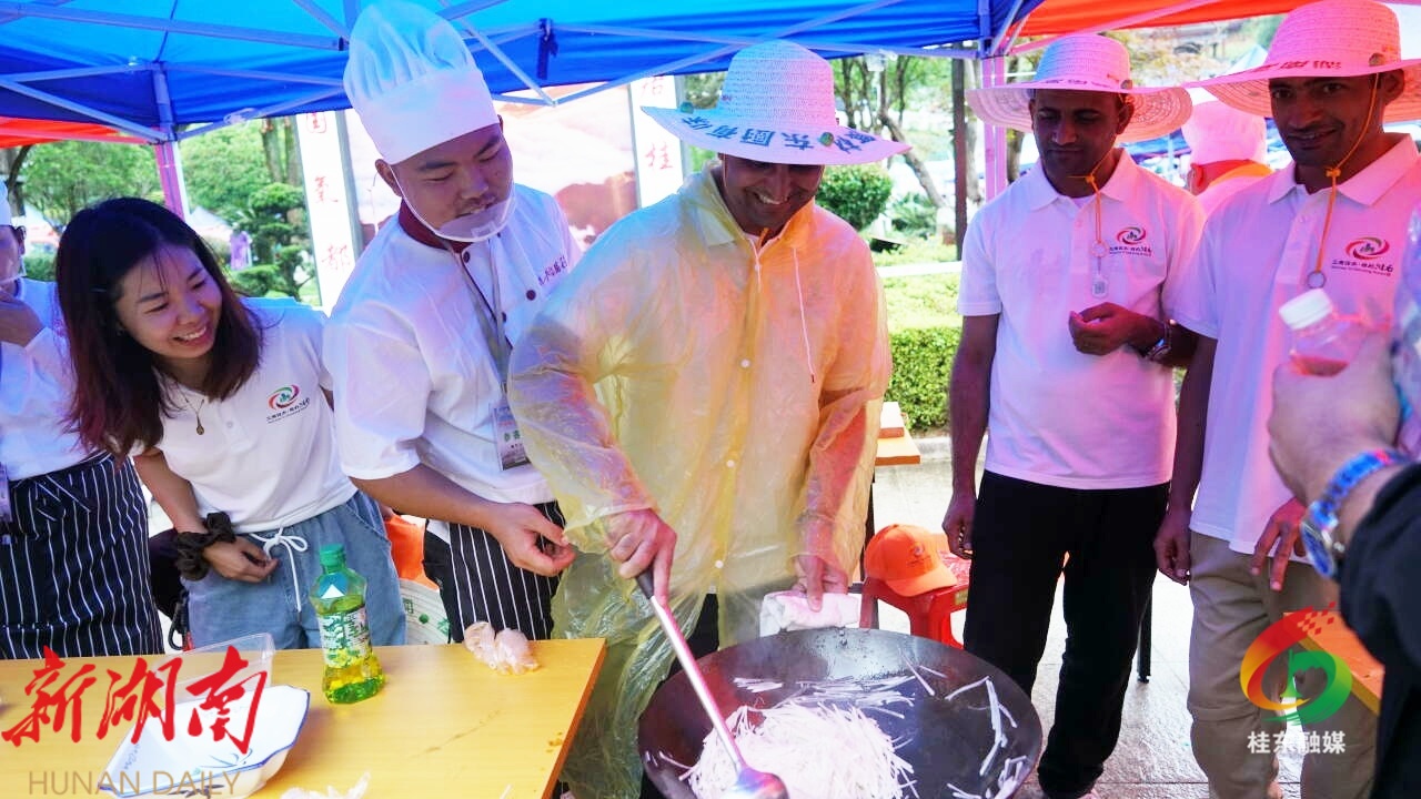 在三台山广场,留学生们走进“村厨大赛”决赛现场,向完赛厨师学做桂东特色菜,参与黄糍粑制作,品尝特色美食,认真了解桂东饮食文化,深度体验“舌尖上的中国”。