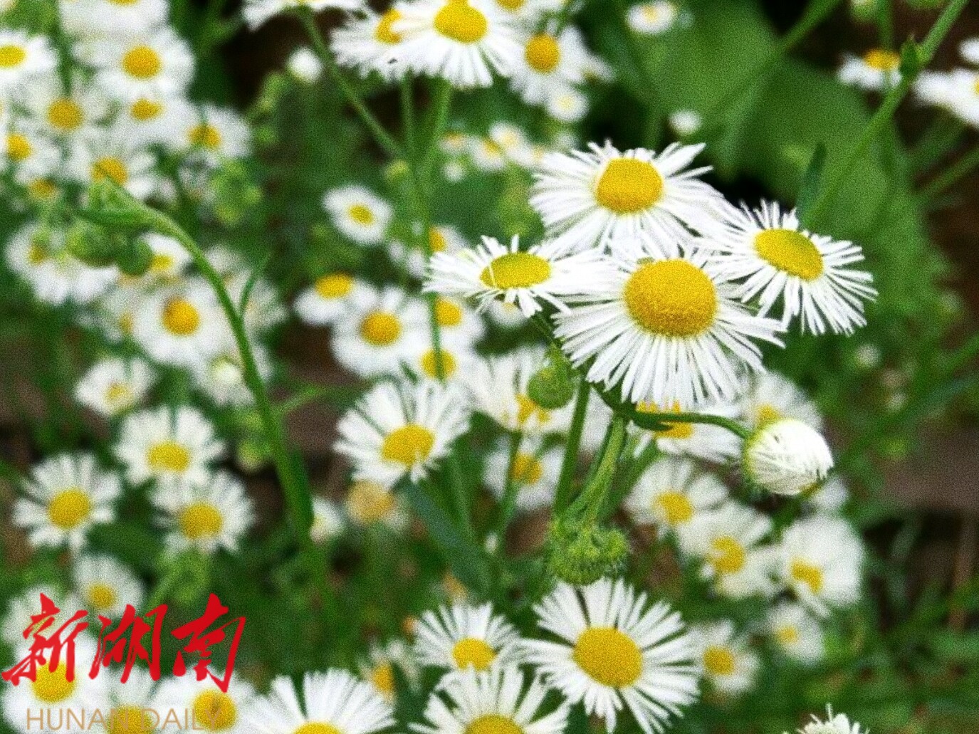 新桂阳6月19日讯(通讯员 尹友飞 黄杰 张利军)初夏时节,樟市镇樟市村道路两旁,一年蓬正值盛花期。星星点点的白色小花缀满田野,宛如散落人间的繁星。花瓣洁白舒展,嫩黄花蕊点缀其间,管状花层层排列,尽显宁静恬淡的自然之美。