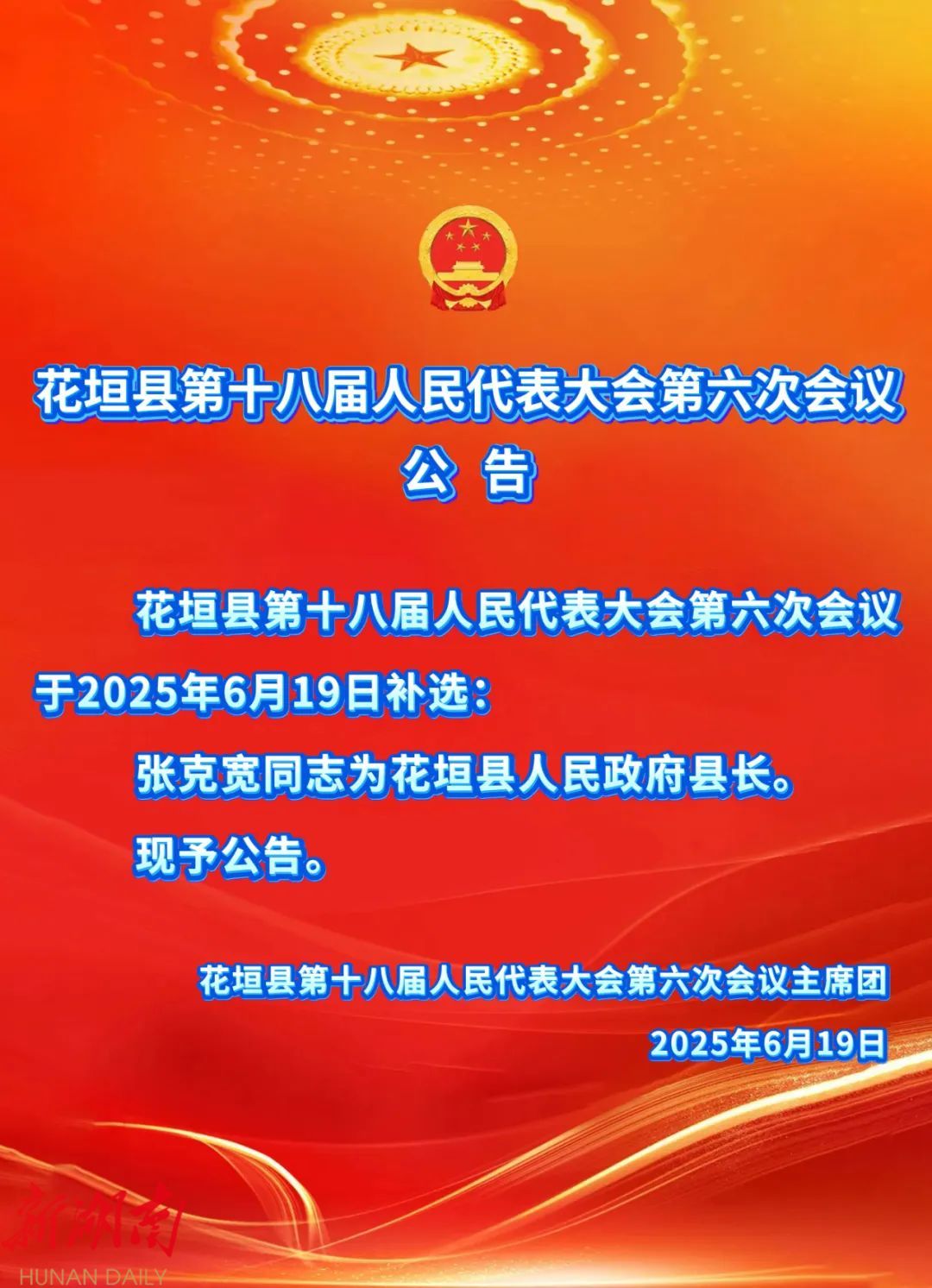 湖南日报·新湖南客户端6月19日讯(通讯员 花仁宣)今天下午,花垣县第十八届人民代表大会第六次会议补选:张克宽同志为花垣县人民政府县长。