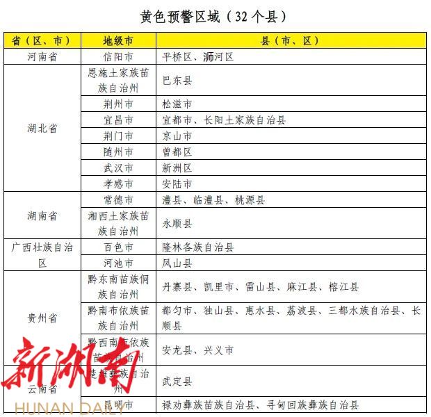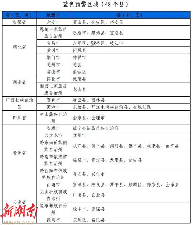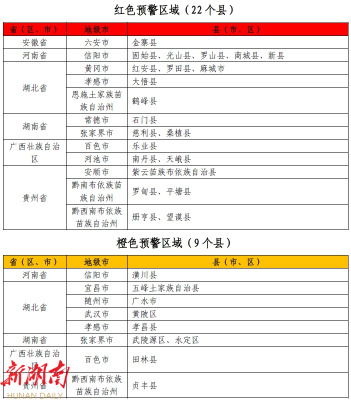 预计,6月19日20时至6月20日20时,安徽西部、河南南部、湖北东部和西南部、湖南北部、广西西北部、贵州南部等地部分地区发生山洪灾害可能性大(橙色预警),局地发生山洪灾害可能性很大(红色预警) ,预警区域涉及的县(市、区)见下表。其他地区也可能因局地短历时强降水引发山洪灾害,请各地注意做好实时监测、防汛预警和转移避险等防范工作。