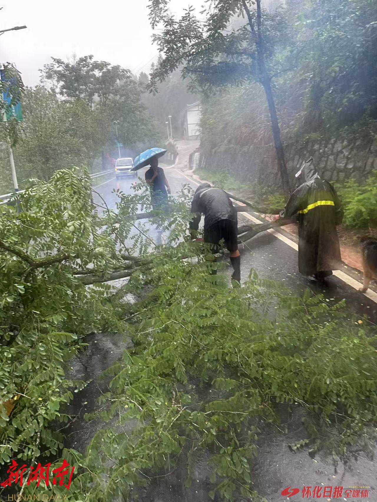 (沅陵县乡镇工作人员迅速行动,帮助清理倒伏的大树 。 )