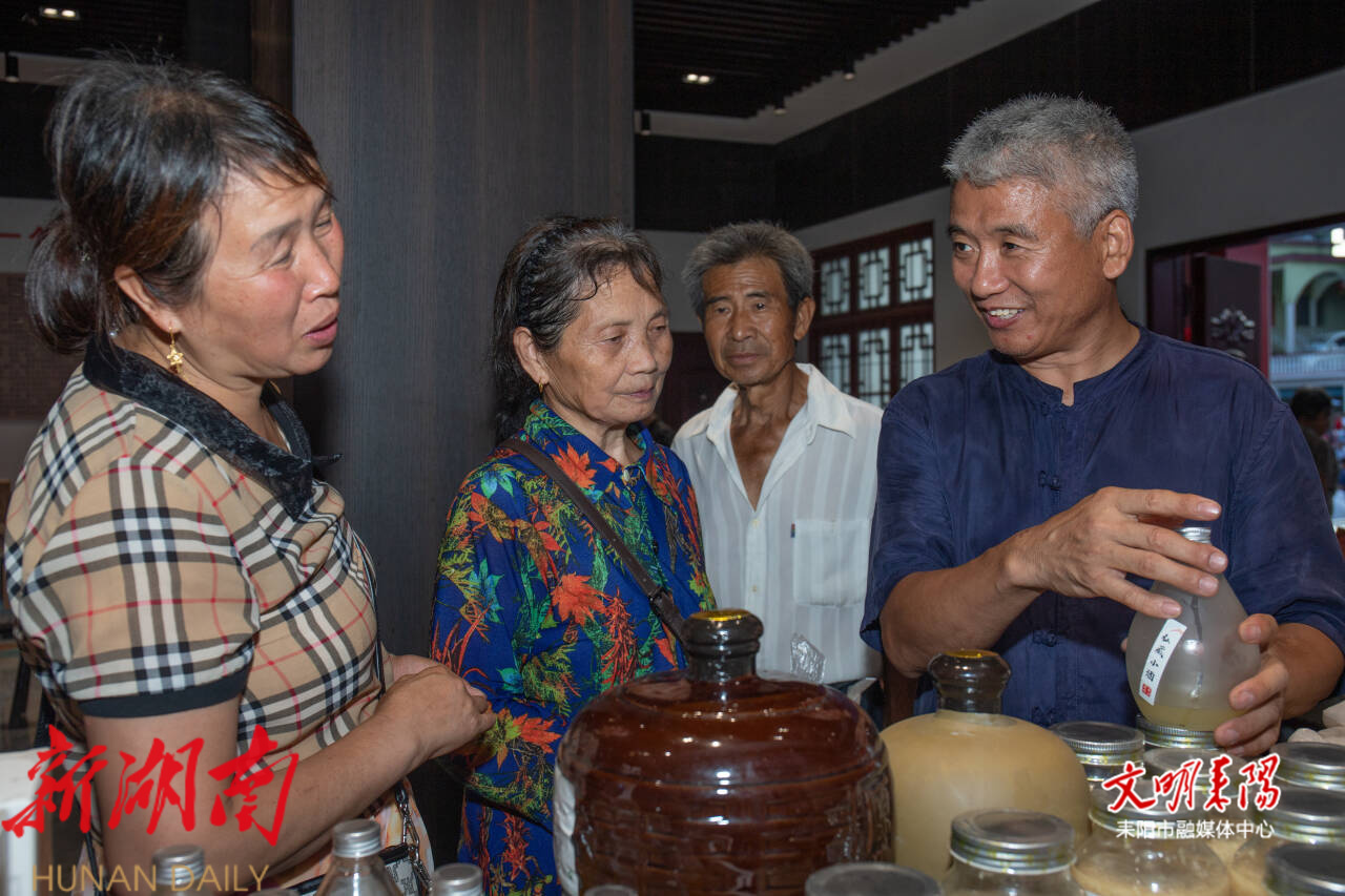 而非遗展览厅变身成乡村非遗市集,耒阳刮皮、仁义面、夏塘麻饼、竹海午时茶、张飞醐酒、耒阳小曲酒药、坛下铜锣、生铁铸锅等十余个本地特色非遗项目集中展示。现场铜锣敲击的铿锵韵律,与传统古法酿制的醇厚酒香、午时茶的清冽药香交织在一起,宛如一幅生动的市井画卷。游客们争相选购、体验,本地土特产也借此机会热销。