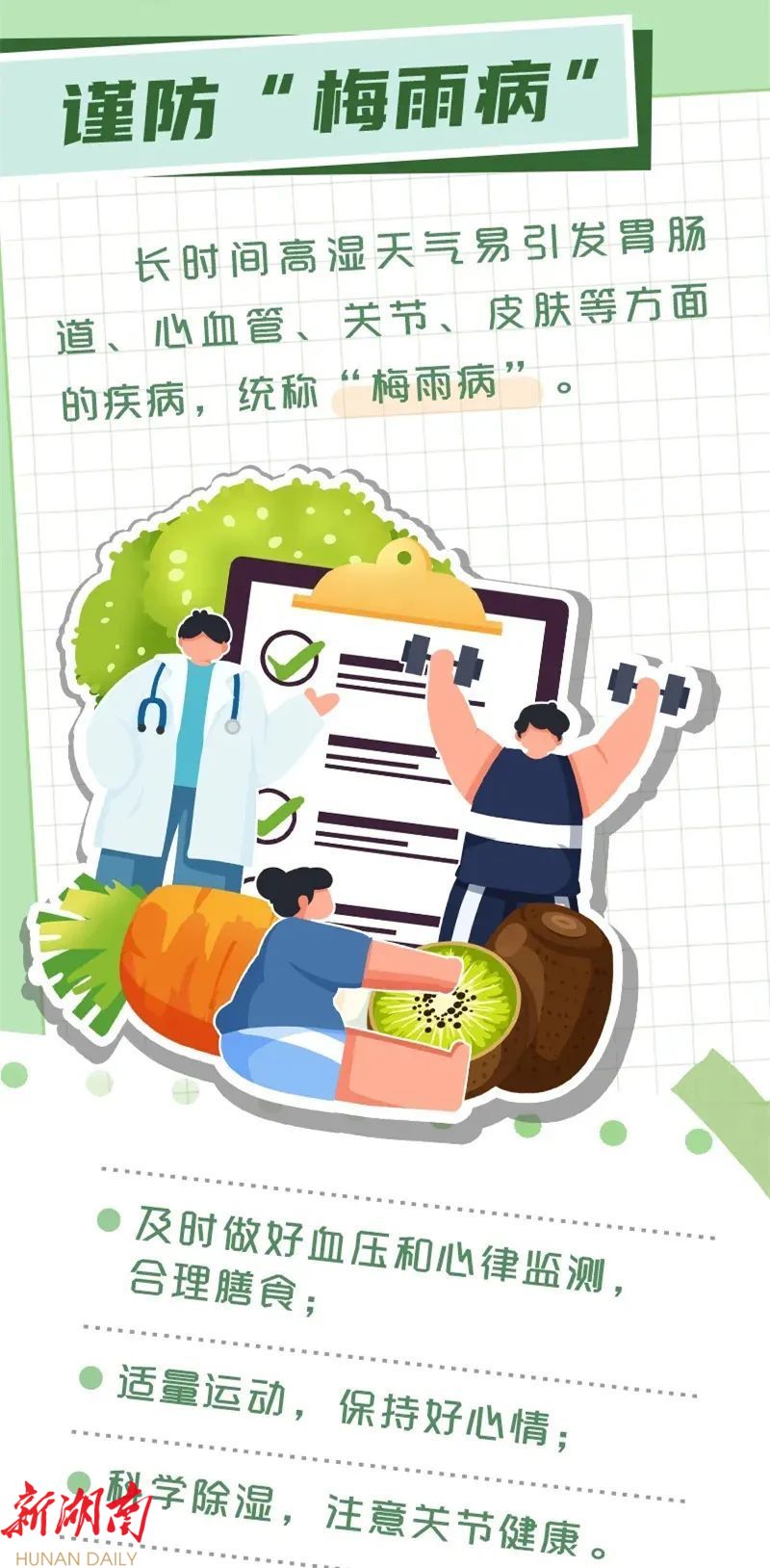此外,由于梅雨持续时间长,湿度大,需时刻关注身心健康,防范“梅雨病”。