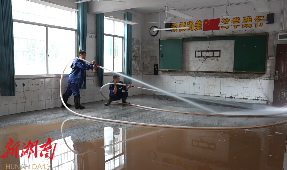 在澧源镇第一小学,消防指战员们正争分夺秒开展清淤作业。面对该校2万平方米的受灾区域,指战员们细致地使用水枪对每一间教室、每一张课桌进行彻底清洗。经过他们的昼夜奋战,原本需要数日才能完成的清淤工作大幅缩短了工期,为学校早日复课创造了有利条件。“衷心感谢国家消防救援局湖南机动队伍,在抗洪救灾中对我校的紧急驰援,我们定会全力配合后续工作,争分夺秒推动全校师生复工复学。”校长刘秀成说道。