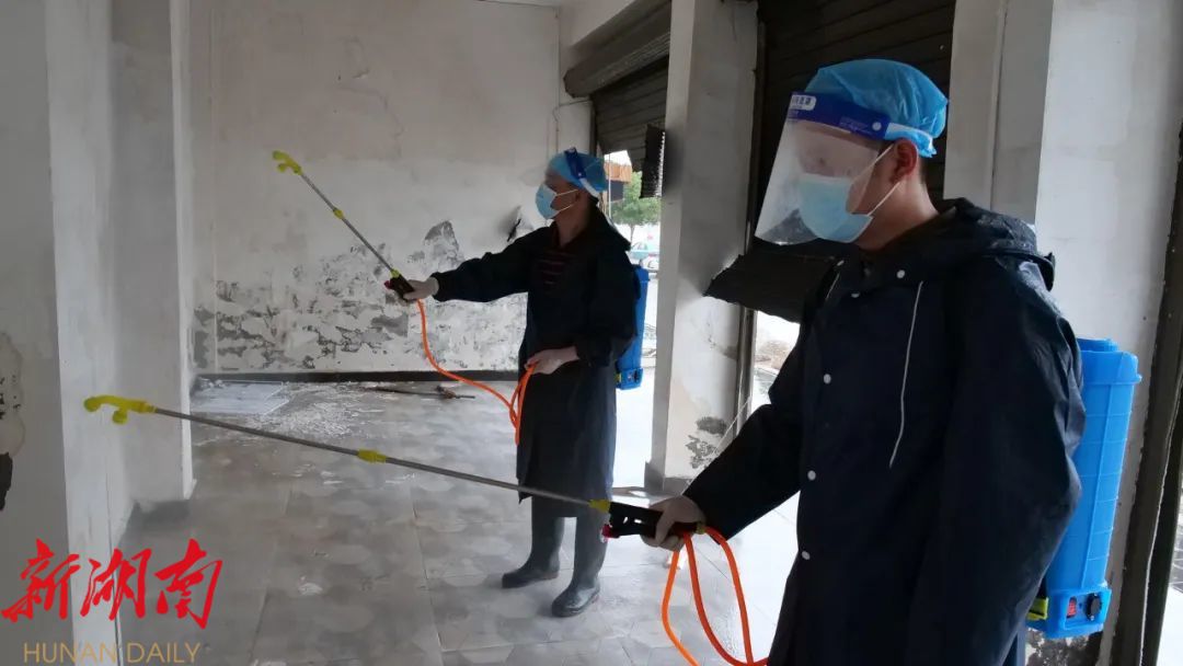 在八斗溪,县疾控中心工作人员身着防护服,背起背负式电动喷雾器,对沿街民房、商铺等区域展开全面消毒作业,仔细将消毒液均匀覆盖墙面、地面及角落,确保不留死角。