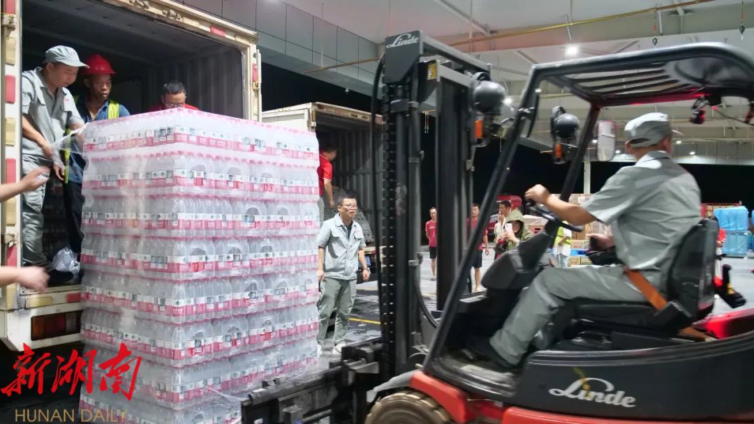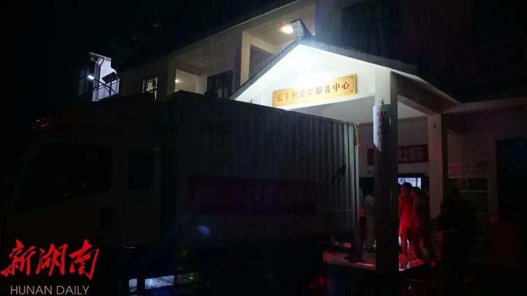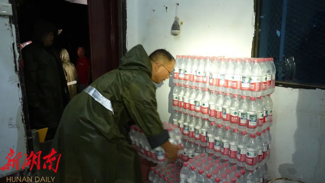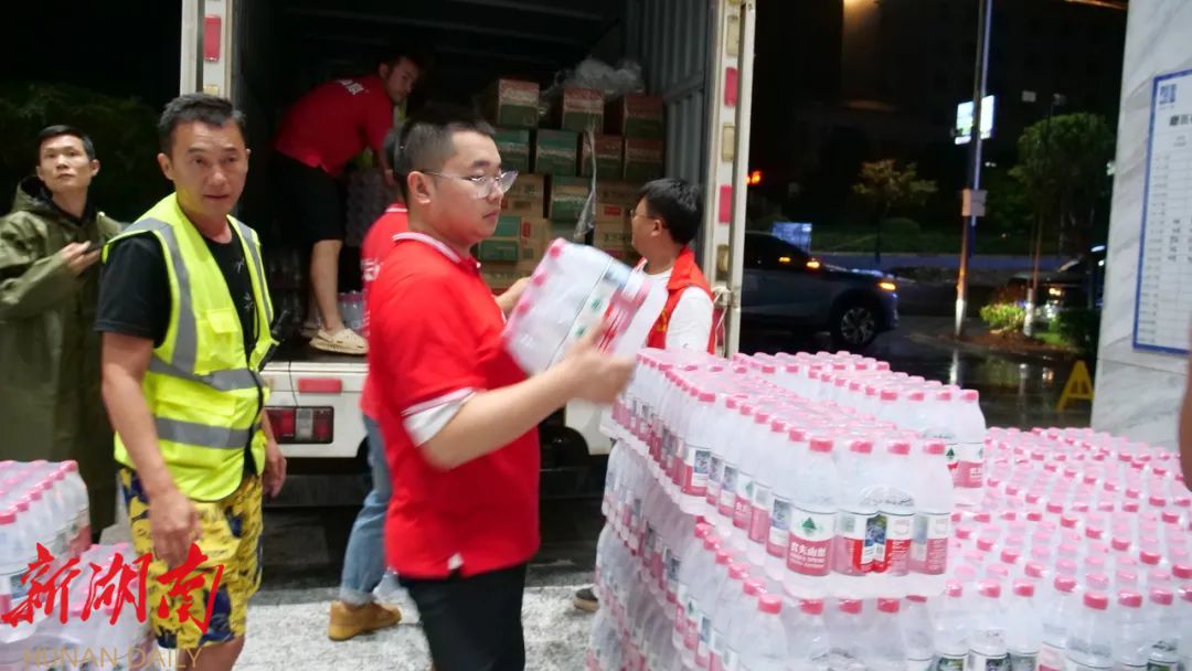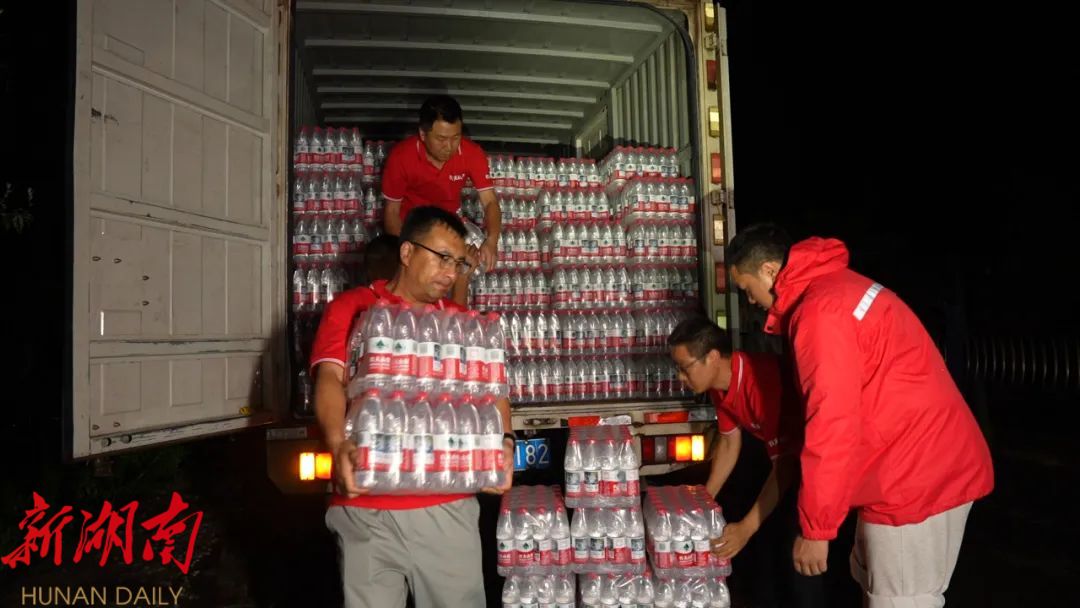 夜幕降临,两辆满载饮用水的货车冲破雨幕,来到桑植县文化体育中心临时安置点、洪家关白族乡云丰村临时安置点、贺龙电站、八斗溪电站等地,为受灾群众和抗洪一线人员送去急需的饮用水。