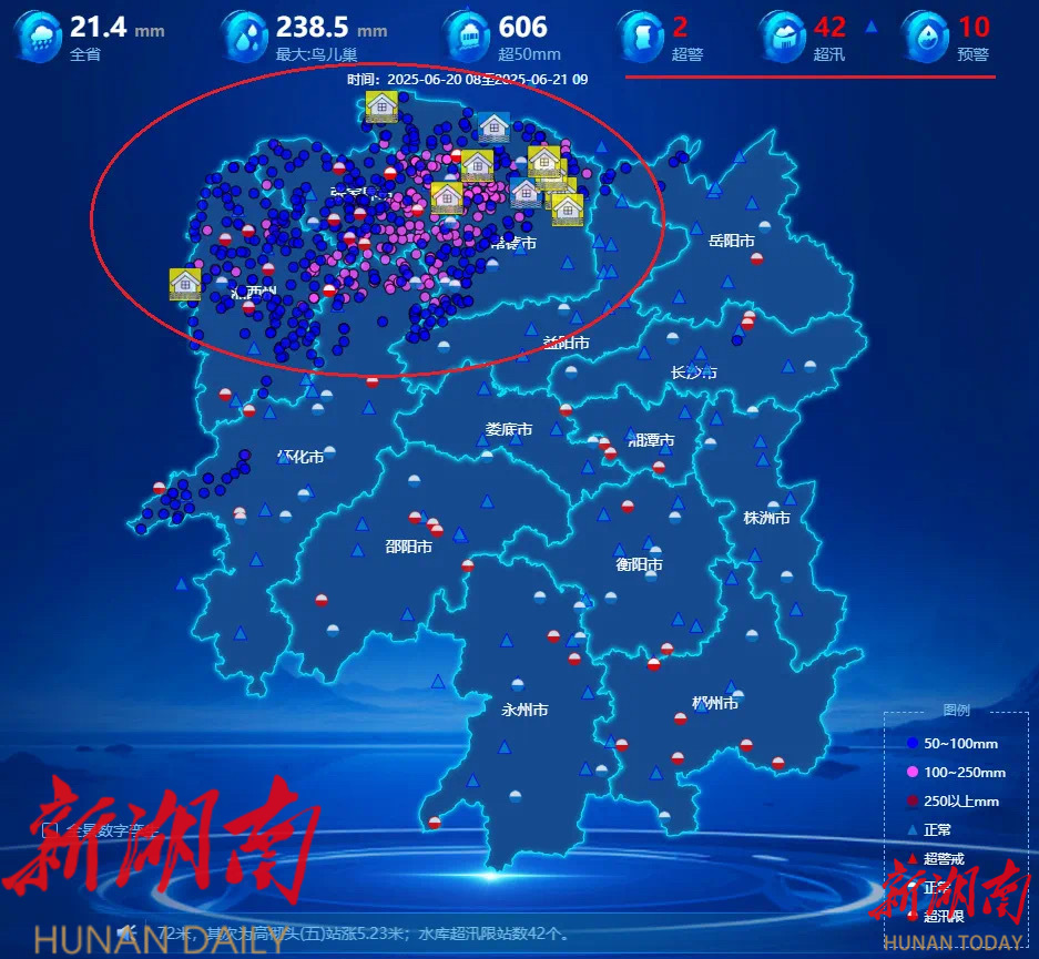 6月21日,记者从湖南省水文中心获悉,6月20日8时至21日8时,全省平均降雨量为20.8毫米,最大为张家界市82.6毫米,常德市65.9毫米,湘西土家族苗族自治州58.8毫米次之。雨量观测点最大降雨为怀化市沅陵县七甲坪镇鸟儿巢站229.5毫米,其次为张家界市慈利县南山坪乡赵家垭站217.5毫米,怀化市沅陵县火场乡石家垭站211.5毫米,共25县591站降雨超过50.0毫米。