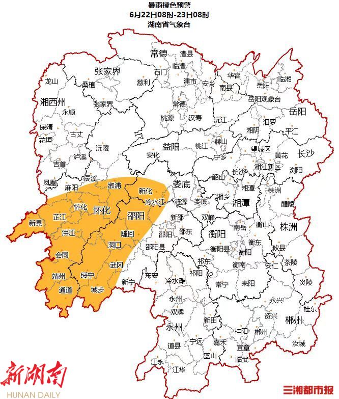 湖南省气象台6月22日06时发布暴雨橙色预警:预计22日08时至23日08时,湘西南部分地区将出现暴雨,其中怀化南部局地大暴雨(100~120毫米),并伴有短时强降水(最大小时雨强20~40毫米)等强对流天气,请加强防范。