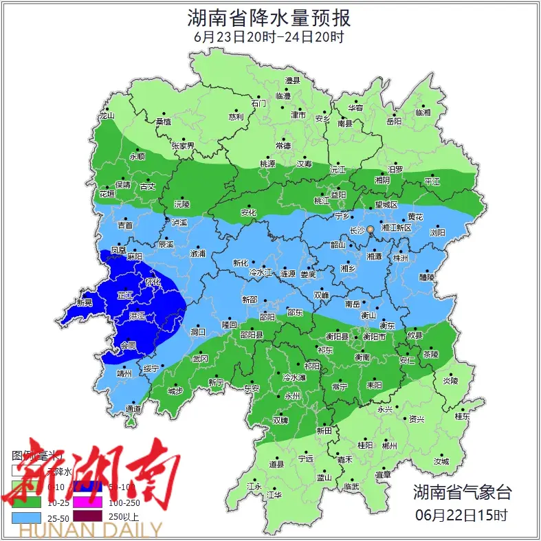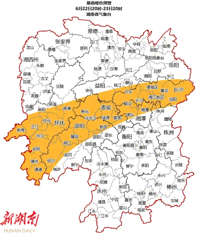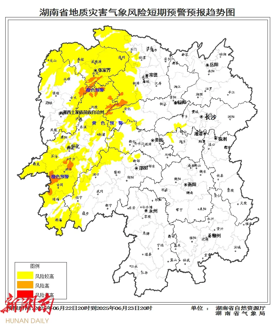 根据地质灾害成灾规律和孕灾条件,结合2025年6月22日短期气象预报情况,省自然资源厅与省气象局联合会商得出如下结论:自6月22日20:00至23日20:00,受降雨影响,湘西的常德、张家界、益阳、怀化、湘西土家族苗族自治州等市州部分山地丘陵区发生突发性地质灾害风险高橙色预警,湘中、湘西的长沙、湘潭、邵阳、常德、张家界、益阳、怀化、娄底、湘西土家族苗族自治州等市州山地丘陵区发生突发性地质灾害风险较高黄色预警。