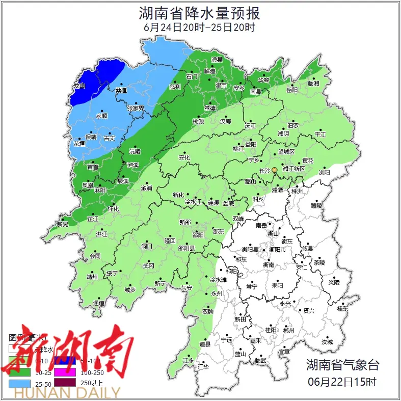 24日晚上至25日白天,湘西北阴天有中到大雨,其中湘西州(龙山、永顺)、张家界(桑植)有暴雨,湘东南多云,其他地区阴天间多云,有小到中等阵雨或雷阵雨;南风2~3级,局地阵风7~9级;最高气温湘中以南32~35℃,湘西北24~28℃,其他地区29~31℃,最低气温湘南23~25℃,其他地区20~22℃。