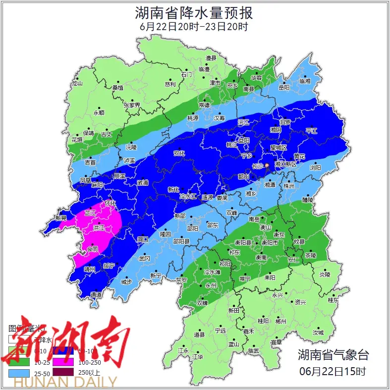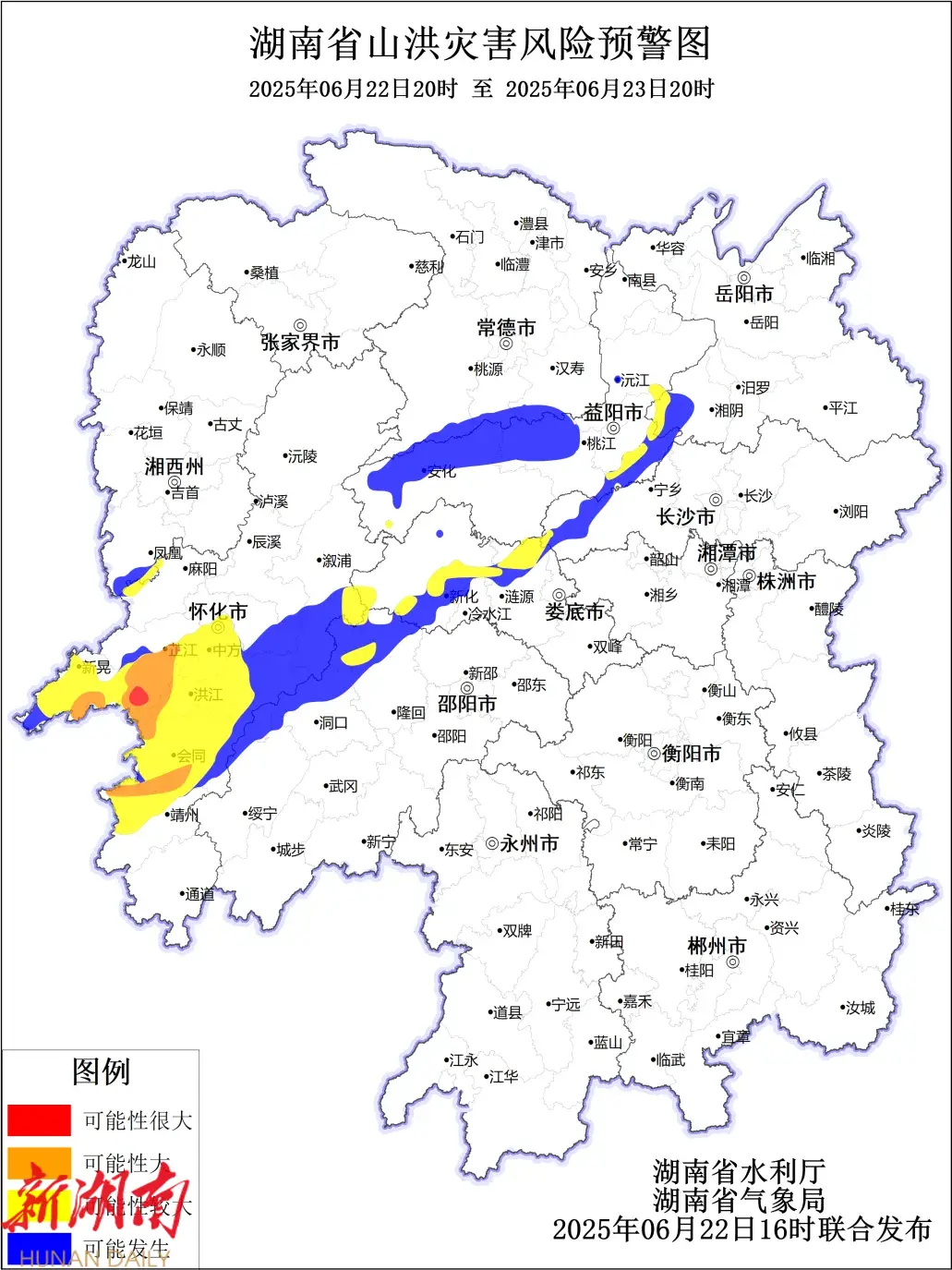 根据省气象局6月22日预报,省水利厅与省气象局联合会商得出如下结论:受降雨影响,22日20:00至23日20:00,怀化市、长沙市、邵阳市、常德市、益阳市、娄底市、湘西州西部等局地发生山洪灾害的可能性很大,具体如下。