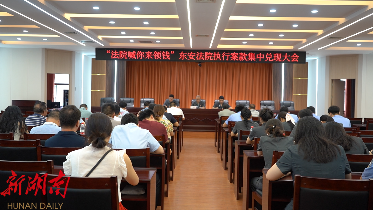 新湖南客户端6月16日讯(通讯员 唐桂海 )6月16日,东安县人民法院举行“五项重点工作”执行案款兑现周暨“未执行到位案件”集中执行专项行动之“法院喊你来领钱”执行兑现大会。