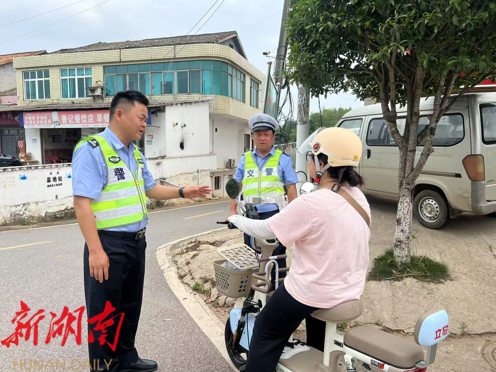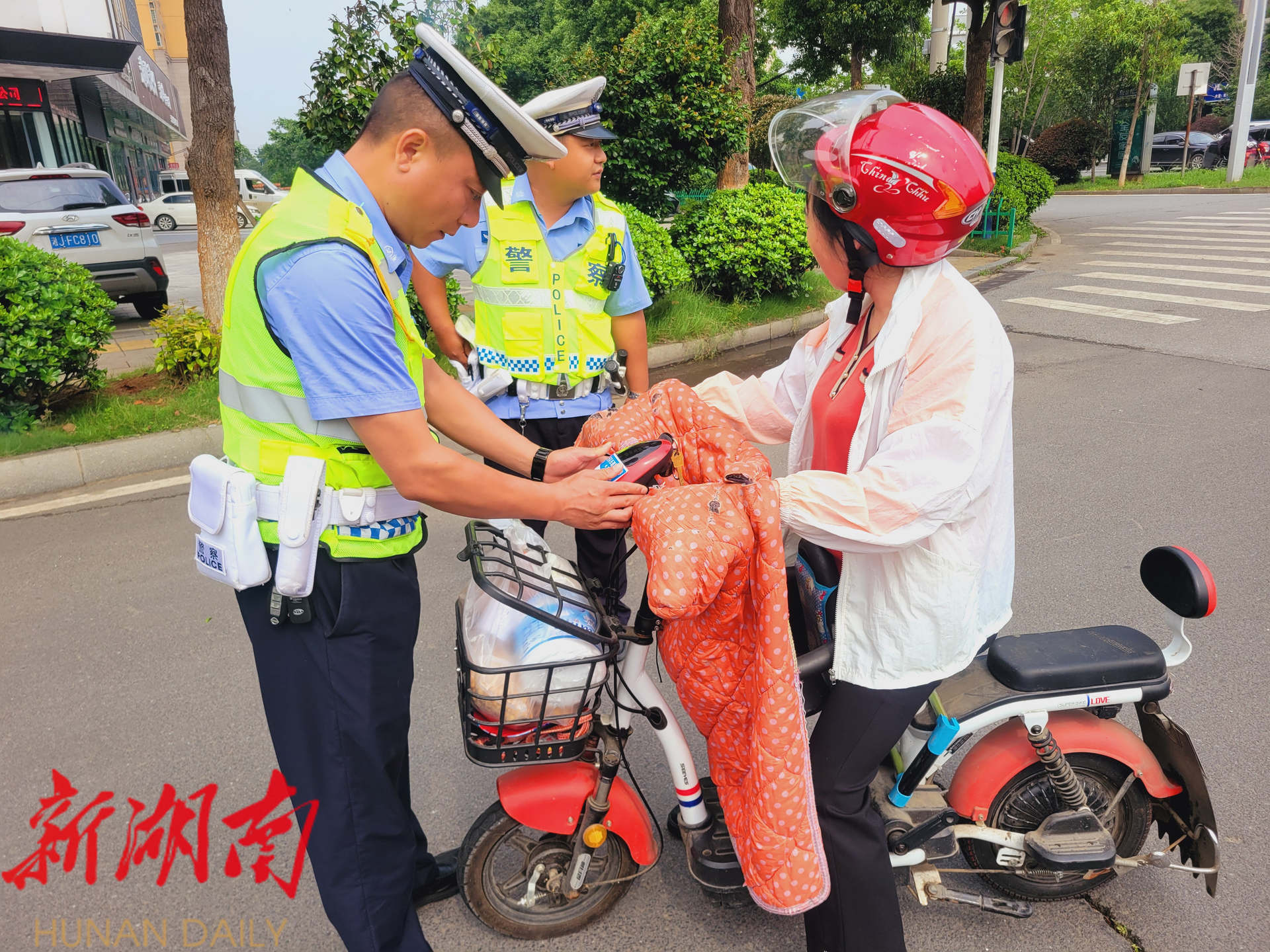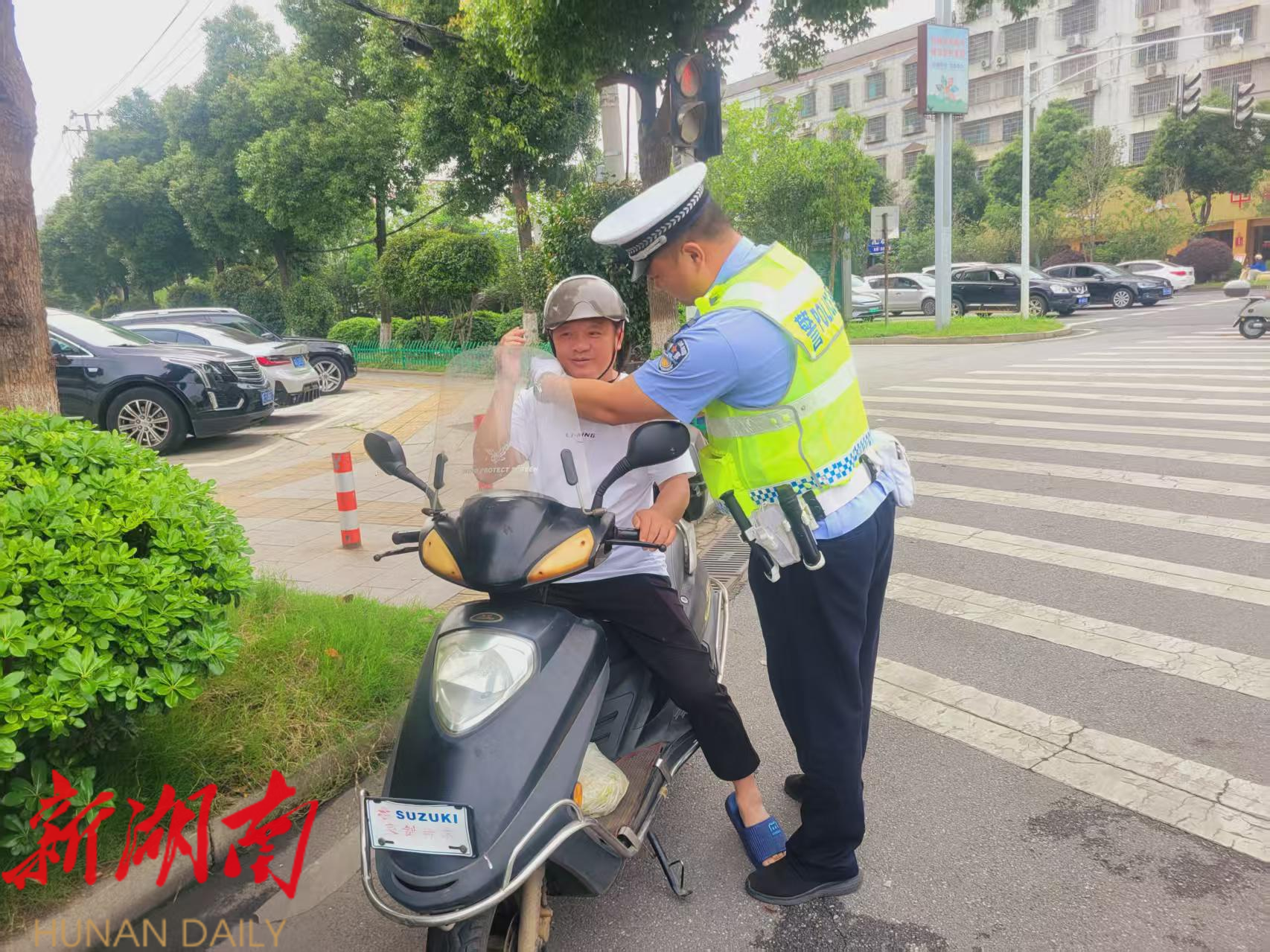 湘阴公安交警帮助群众调整佩戴不规范的头盔。