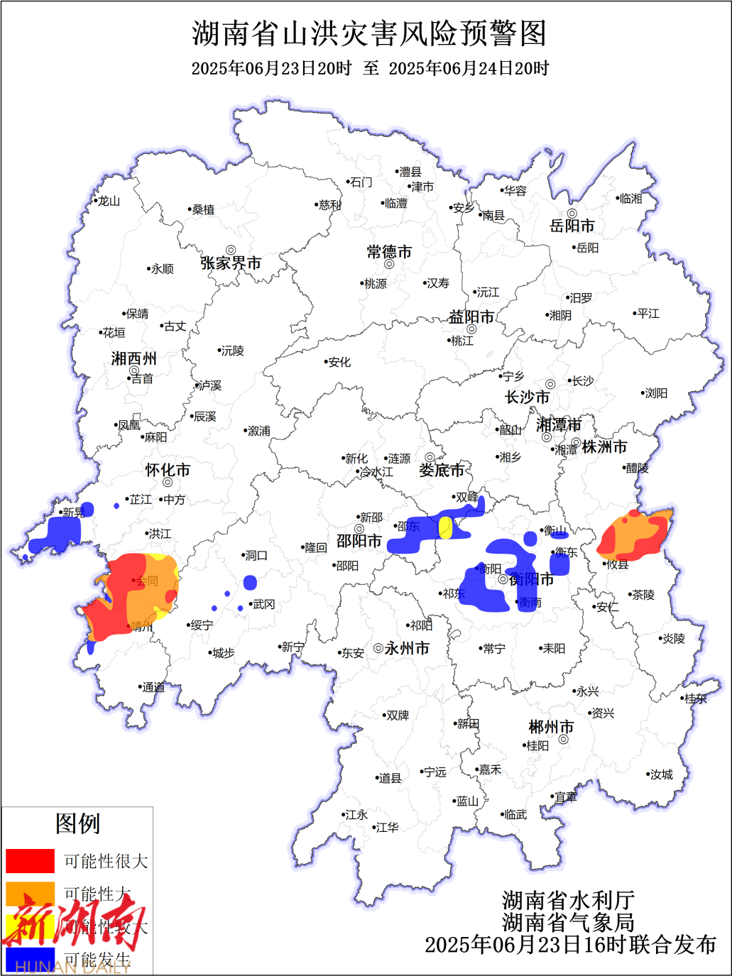 根据省气象局6月23日预报,省水利厅与省气象局联合会商得出如下结论:受降雨影响,23日20:00至24日20:00,衡阳市、株洲市、邵阳市、怀化市、娄底市等地可能发生山洪灾害,具体如下。