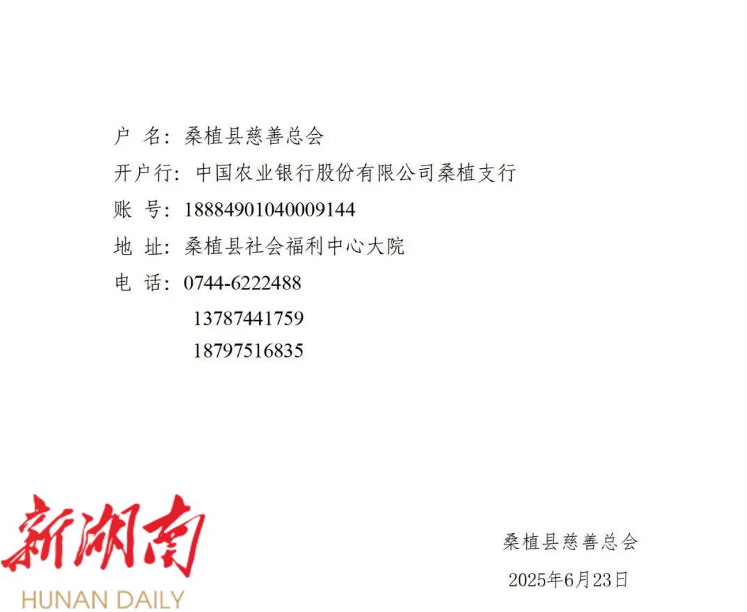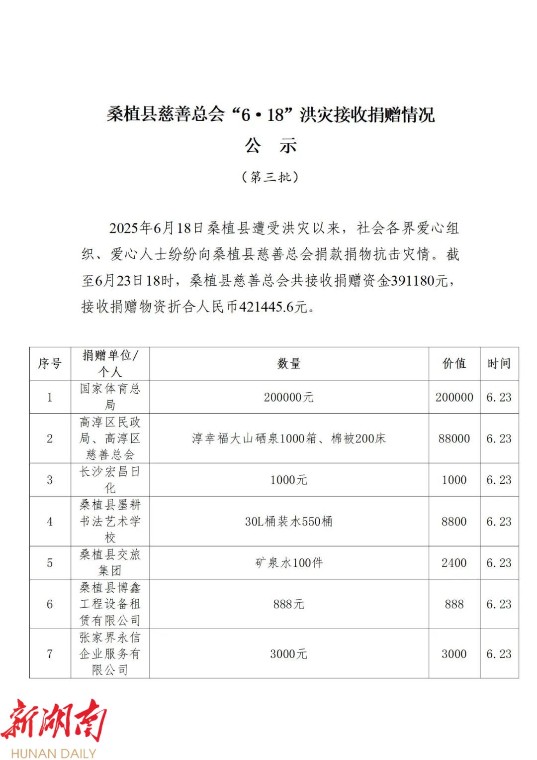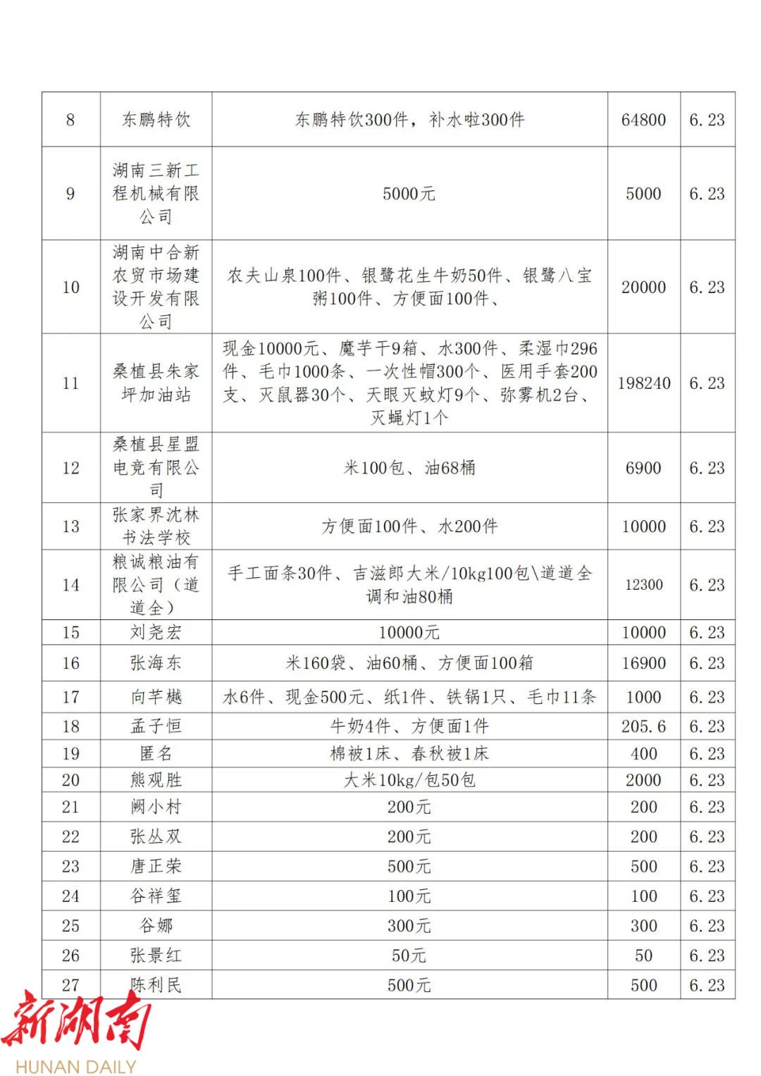 桑植县慈善总会“6·18”洪灾接收捐赠情况公示