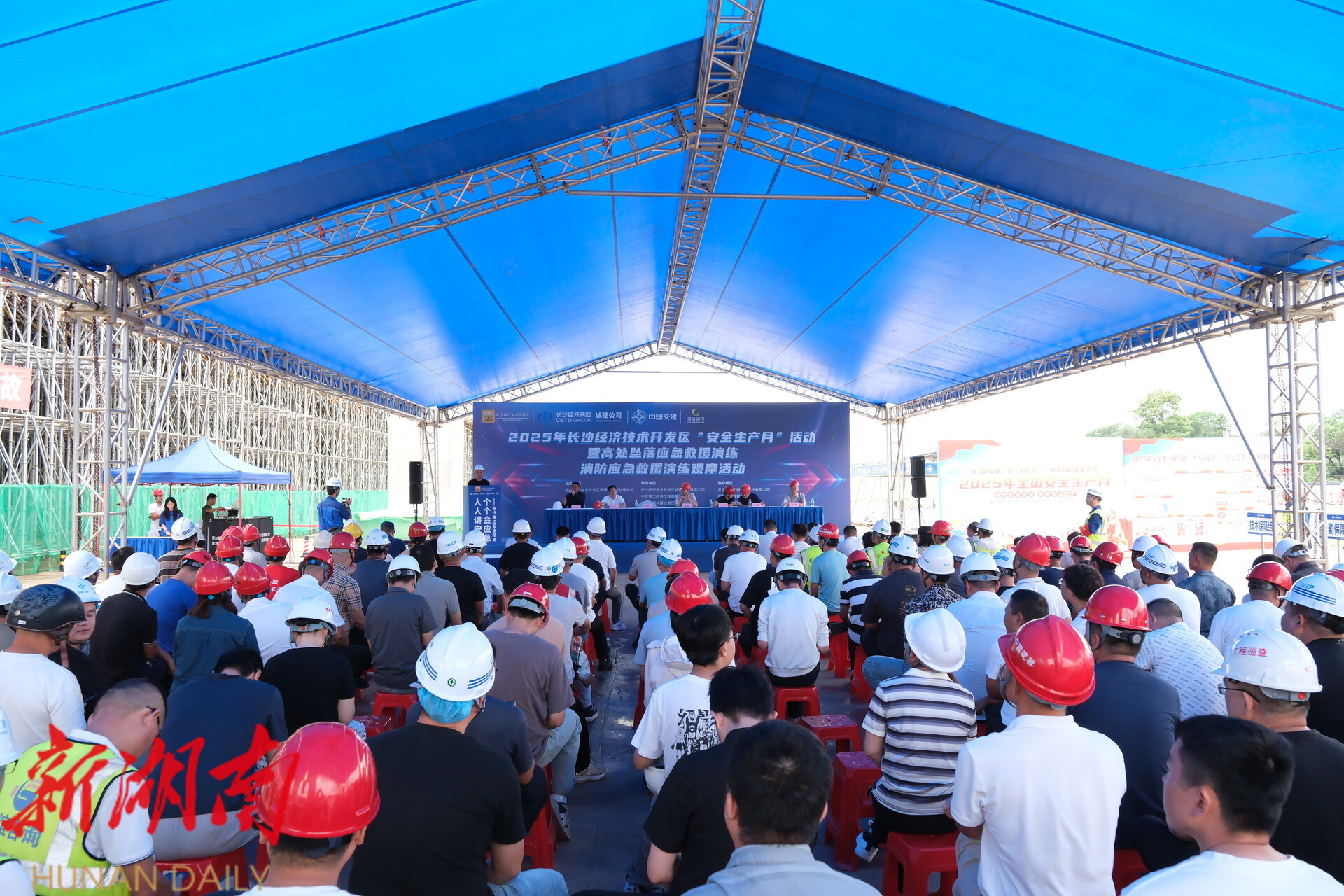 湖南日报·新湖南客户端6月24日讯(长沙经开区工作站记者 李杰 通讯员 余鹏) 6月24日上午,长沙经开区规划建设局在长沙经开区劳动东路3标段道路工程施工现场组织开展建筑施工应急救援演练活动。本次活动由长沙经开区规划建设局主办,长沙经开区城建开发有限公司、中交第二航务工程局有限公司、湖南省绿林建设集团有限公司承办,榔梨消防救援站、长沙经开医院协同参与,区规划建设局全体监督工作人员及园区在建项目建设、施工、监理单位项目负责人共200余人现场观摩学习。