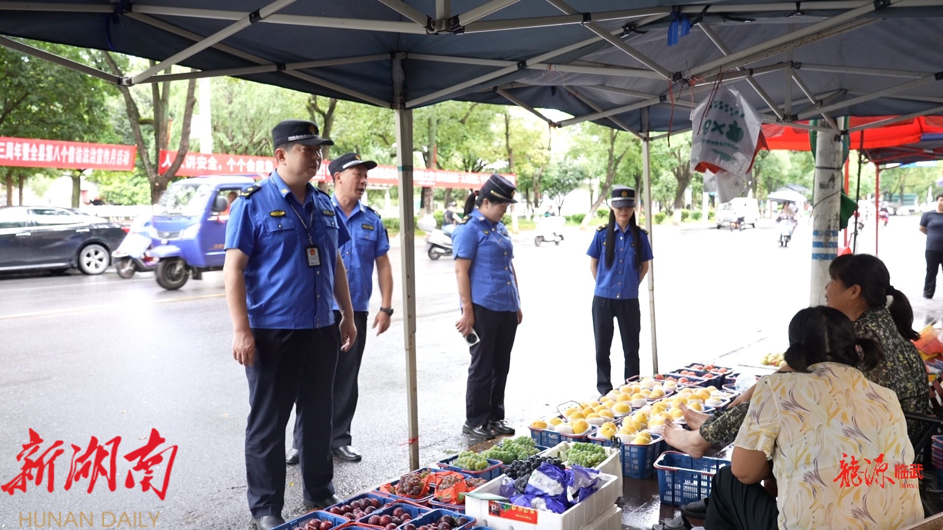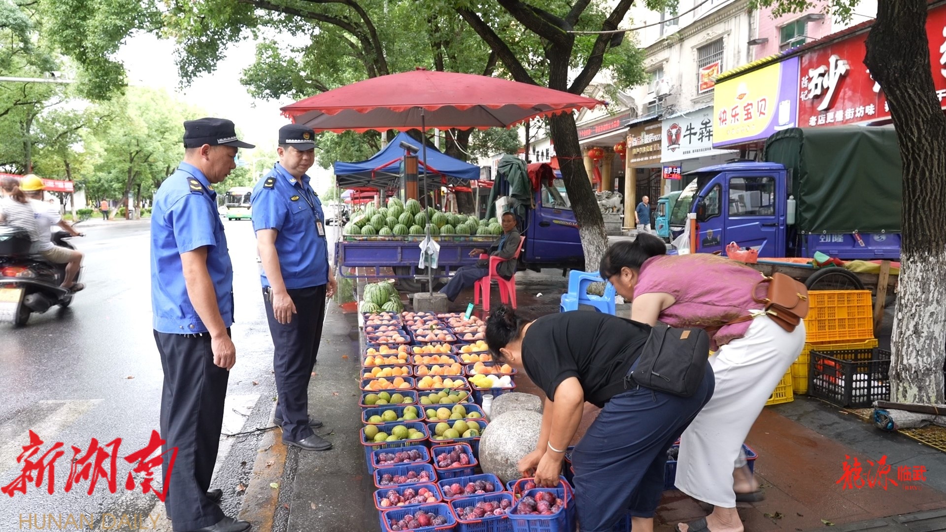 在临武大道与文昌南路交会处,整齐划一的临时水果摊点格外醒目。西瓜、葡萄等时令水果琳琅满目,摊主们正忙着整理货品。城管执法人员则在开展巡查,不时提醒摊主保持摊位整洁。
