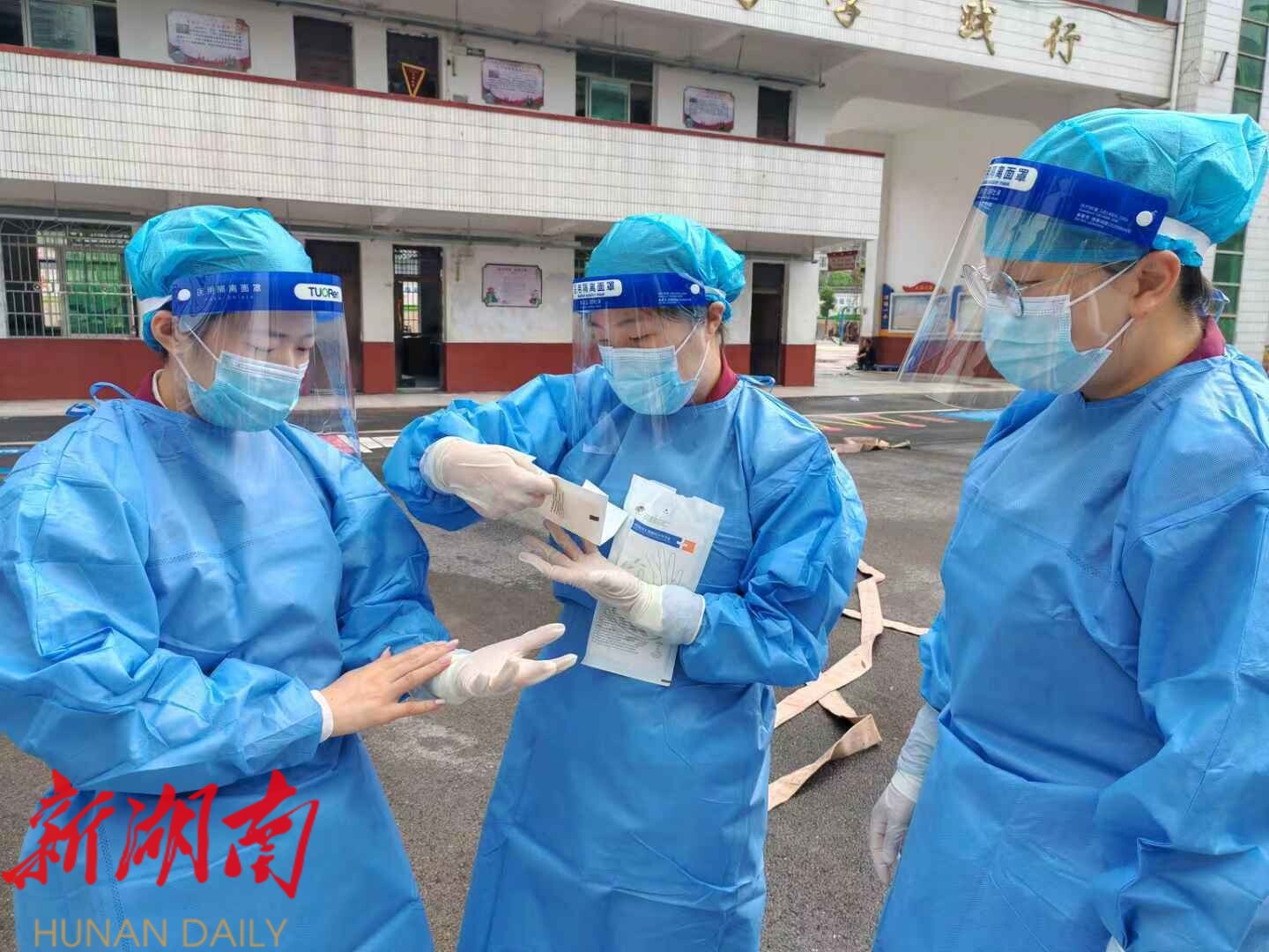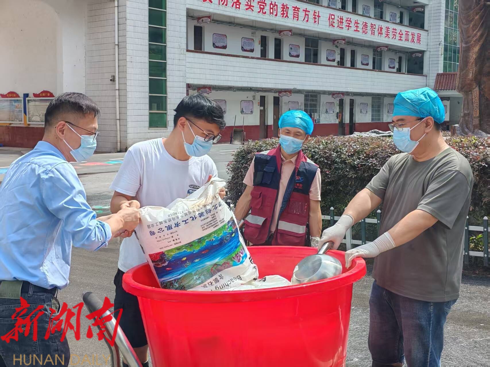“507班教室已经完成全面消毒!”6月23日上午,在澧源镇一小的校园消毒现场,25岁的陈星和她的同事们一起,背着沉重的电动喷雾器在每间教室里喷洒消毒,汗水混杂着消毒水,浸透了她们身上的“红马甲”。