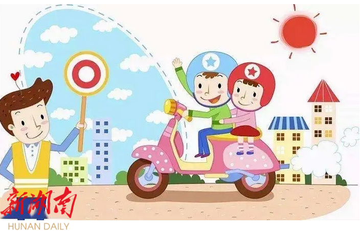 家长驾驶摩托车、电动车接送孩子时,要做到“戴头盔、靠右行、载一人、不闯灯”。驾驶员和乘坐人员一定要自觉戴好安全头盔,系好固定卡扣。