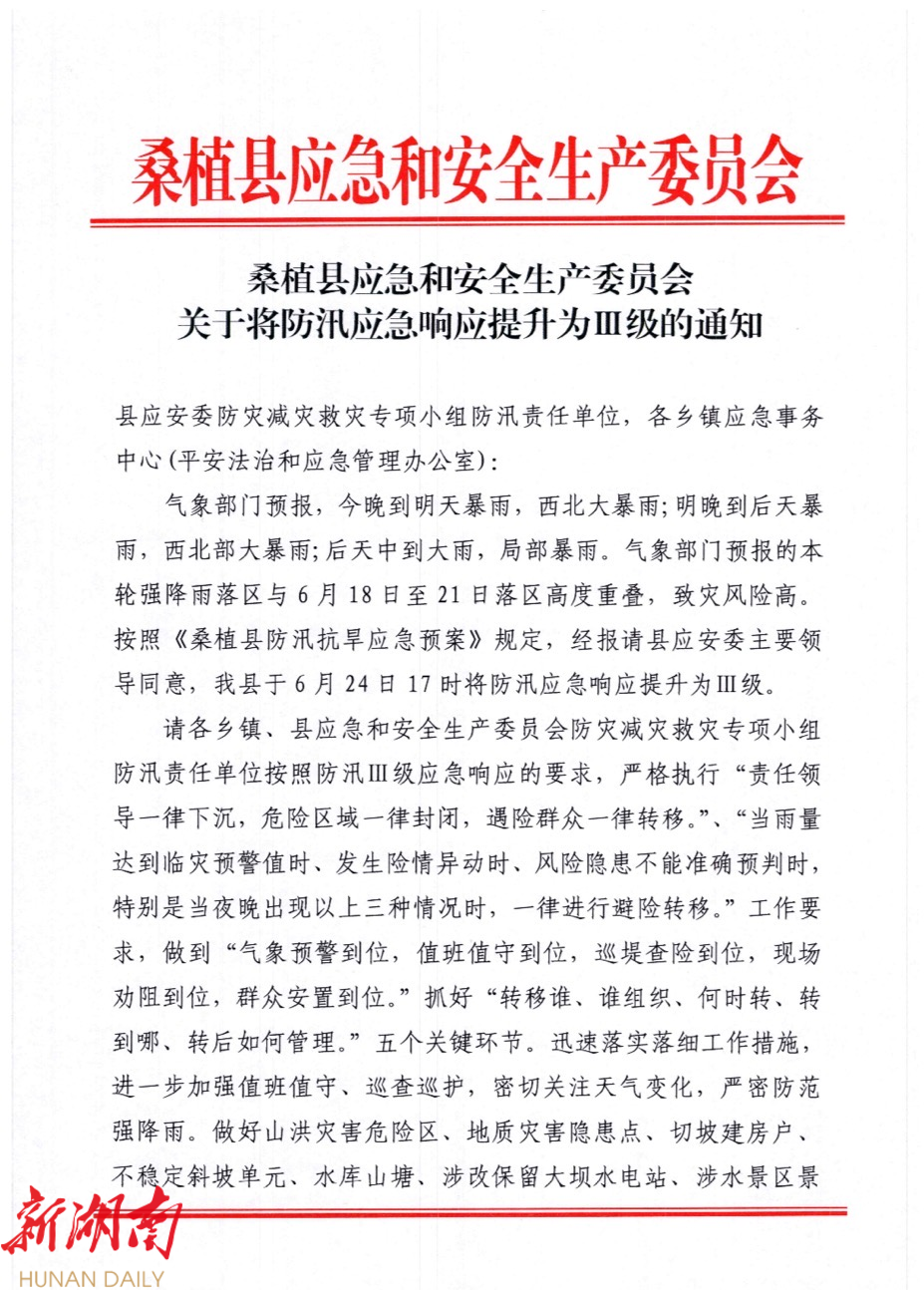 根据气象部门预报,本轮强降雨落区与6月18日至21日落区高度重叠,按照《桑植县防汛抗旱应急预案》规定,经报请县应安委主要领导同意,我县于6月24日17时将防汛应急响应提升为Ⅲ级。