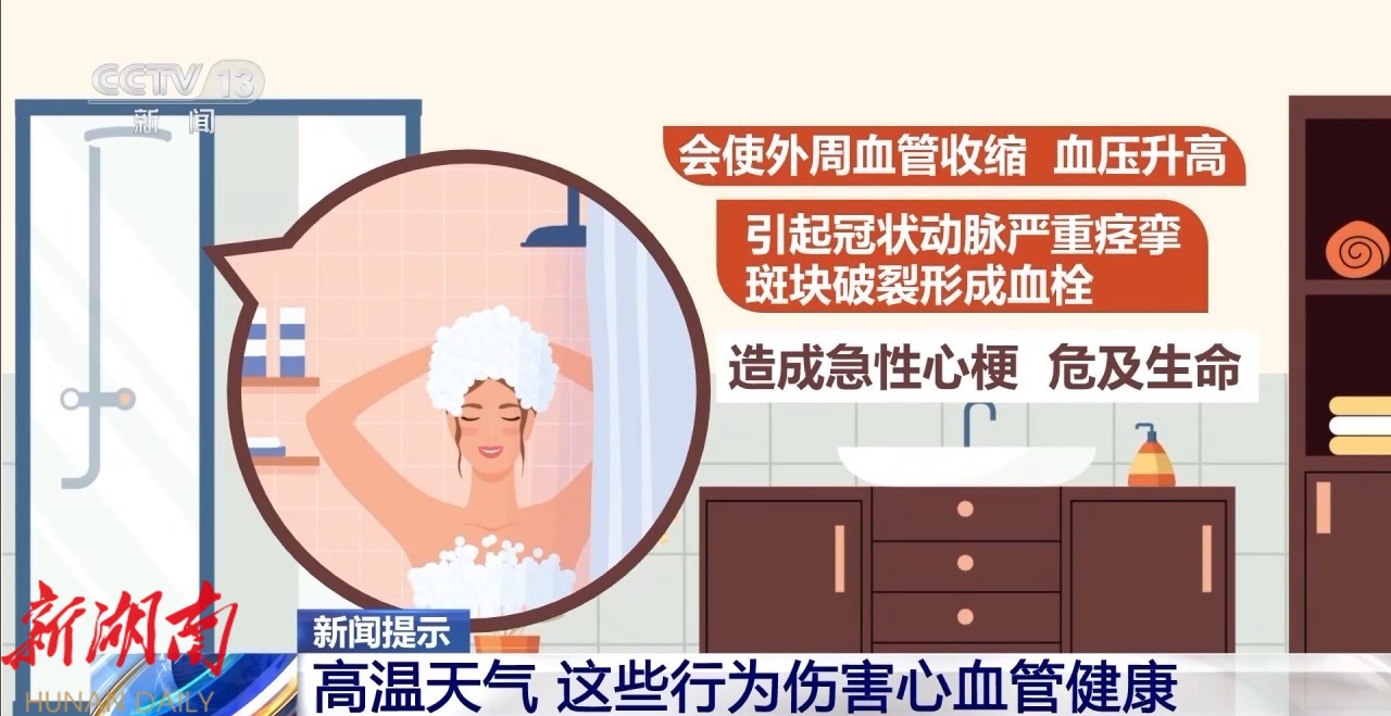气温高时,人体温度也会升高,洗冷水澡时突然的冷刺激,不仅会使外周血管收缩、血压升高,有时甚至会引起冠状动脉严重痉挛、斑块破裂形成血栓,从而造成急性心梗,危及生命。
