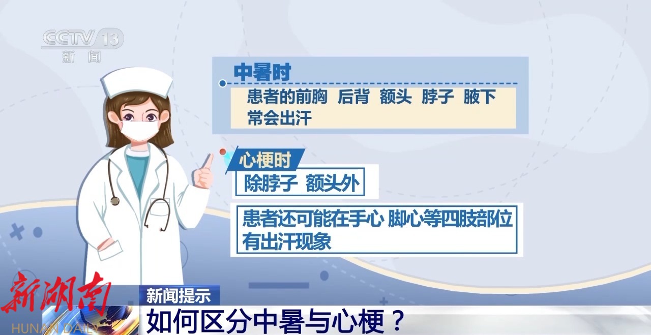 中暑时,患者的前胸、后背、额头、脖子、腋下常会出汗。心梗时,除脖子、额头外,患者还可能在手心、脚心等四肢部位有出汗现象。