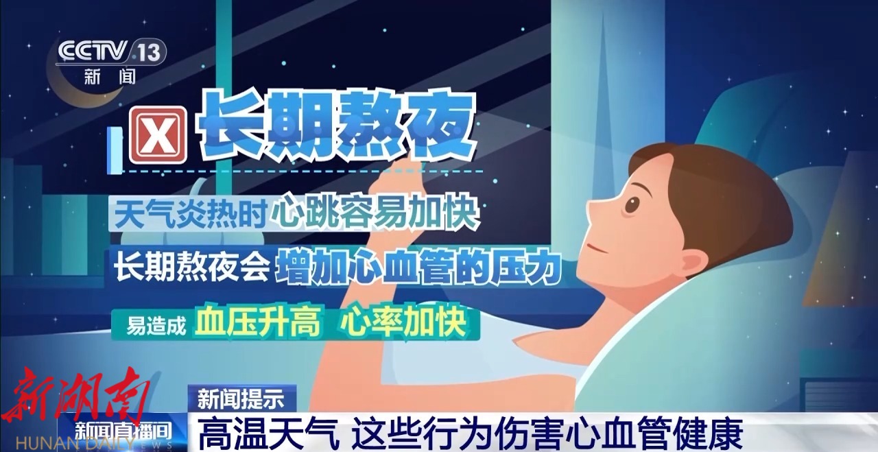 天气炎热时心跳容易加快,长期熬夜会增加心血管的压力,易造成血压升高、心率加快,长此以往易诱发心血管疾病。
