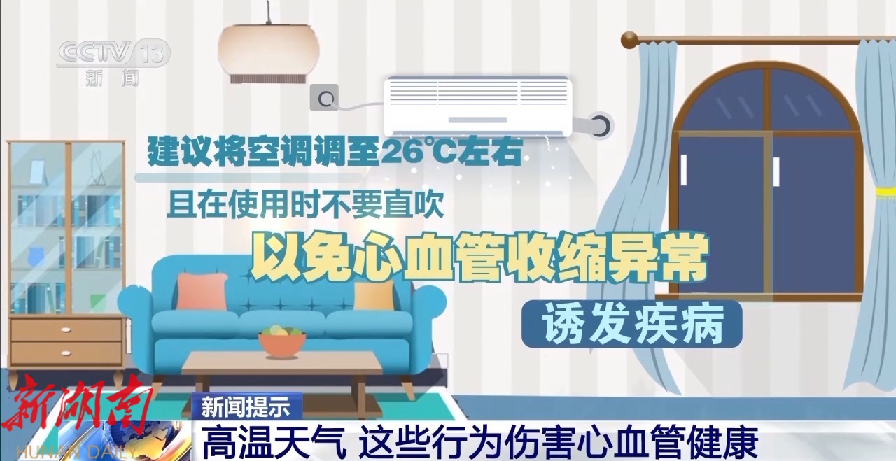 建议将空调调至26℃左右,且在使用时不要直吹,以免心血管收缩异常,诱发疾病。