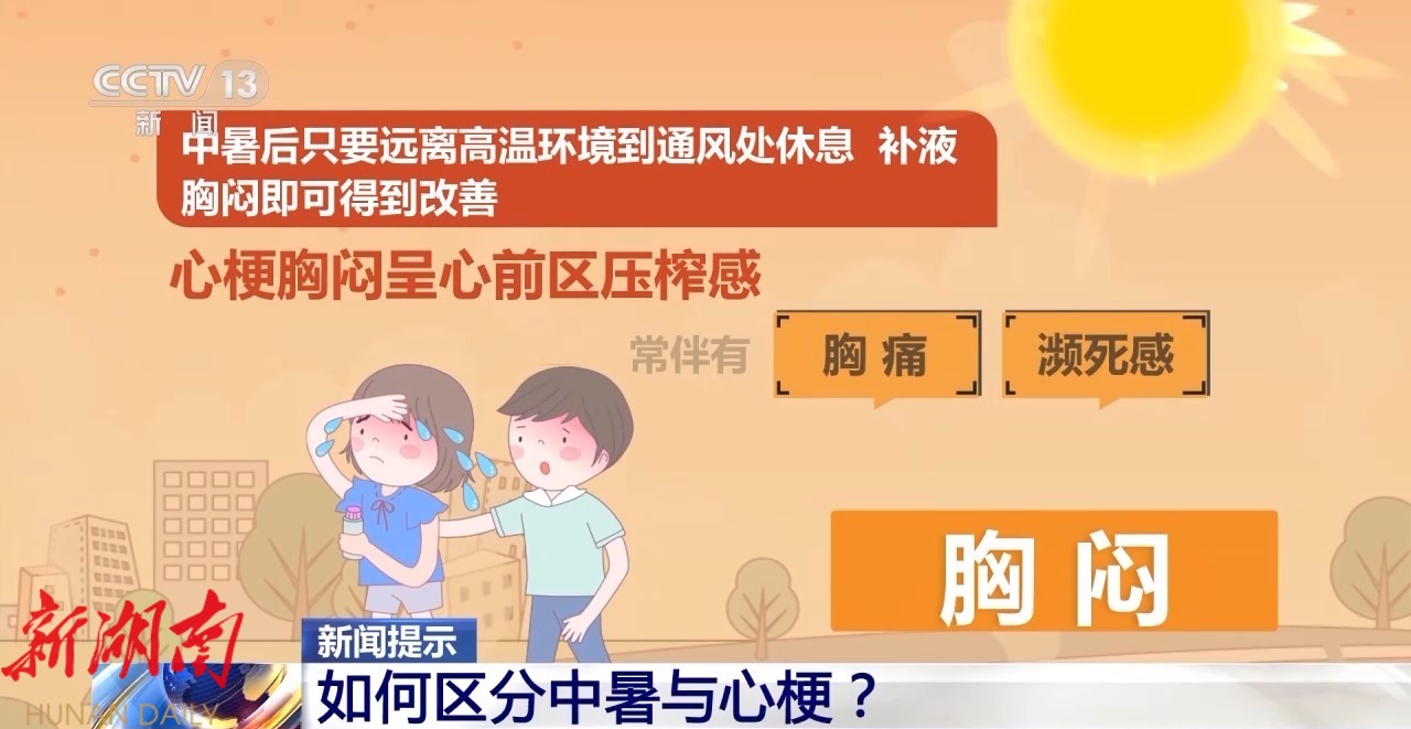 通常,中暑后只要远离高温环境,到通风处休息、补液,胸闷即可得到改善。心梗胸闷呈心前区压榨感,常伴有胸痛和濒死感。