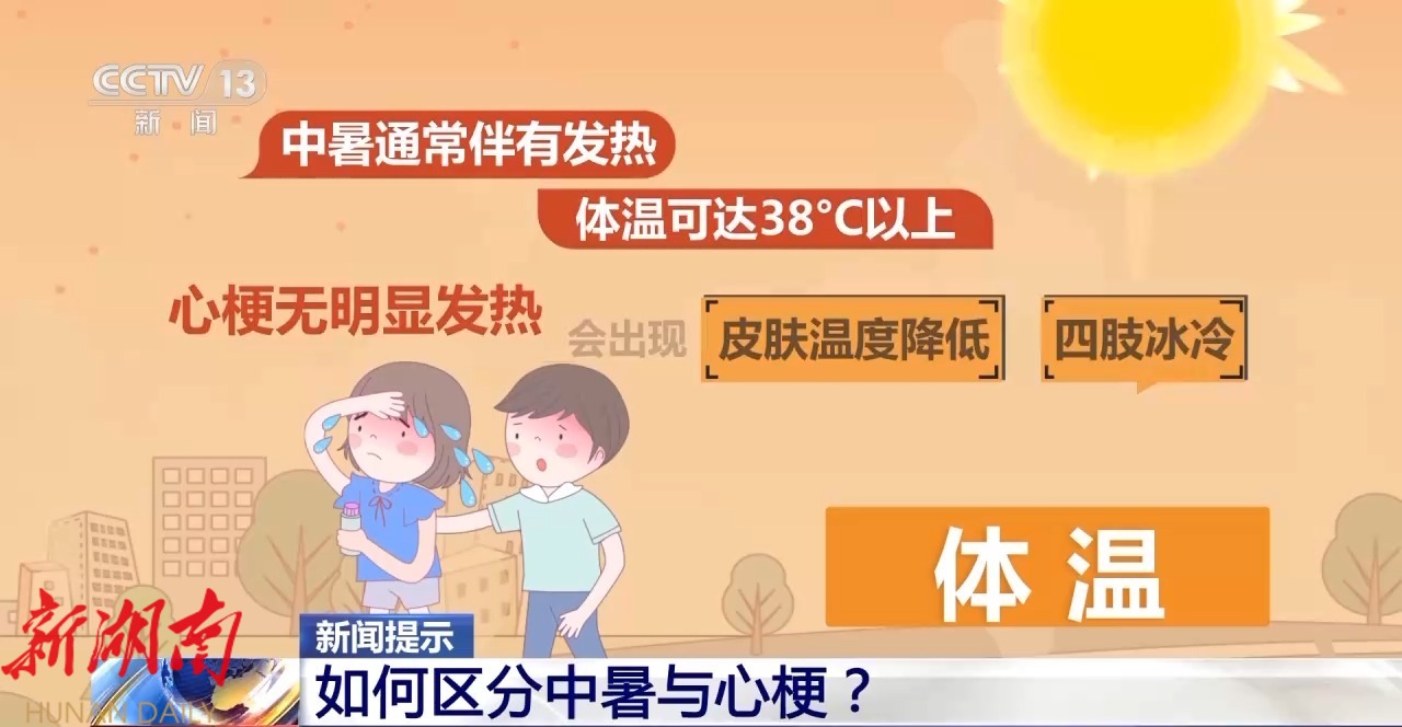 中暑通常伴有发热,体温可达38℃以上。心梗无明显发热,会出现皮肤温度降低、四肢冰冷。