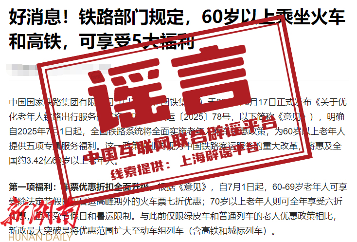 真相: 近日,网上有信息称:“中国国家铁路集团有限公司在5月17日曾发布文件,明确自7月1日起,60-69岁老年人可享受除法定节假日和暑运高峰期外的火车票七折优惠;70岁以上老年人则可全年享受六折优惠,且不受节假日和暑运限制。”经核查,上述网络传言不实。国铁集团所有官方信息发布渠道都没有发布所谓《关于优化老年人铁路出行服务的实施意见》的文件。中国铁路12306客服也回应称,中国铁路未发布过上述文件,目前60岁以上老人购票暂无折扣优惠。进一步溯源发现,相关信息大概率为自媒体或营销号利用AI软件生成,其利用老年人的出游意愿以及对车票信息的关注度,使用AI大模型编写虚假信息,依旧是“博眼球,拉流量,变现谋利”的套路。(来源:“上海网络辟谣”微信公众号)