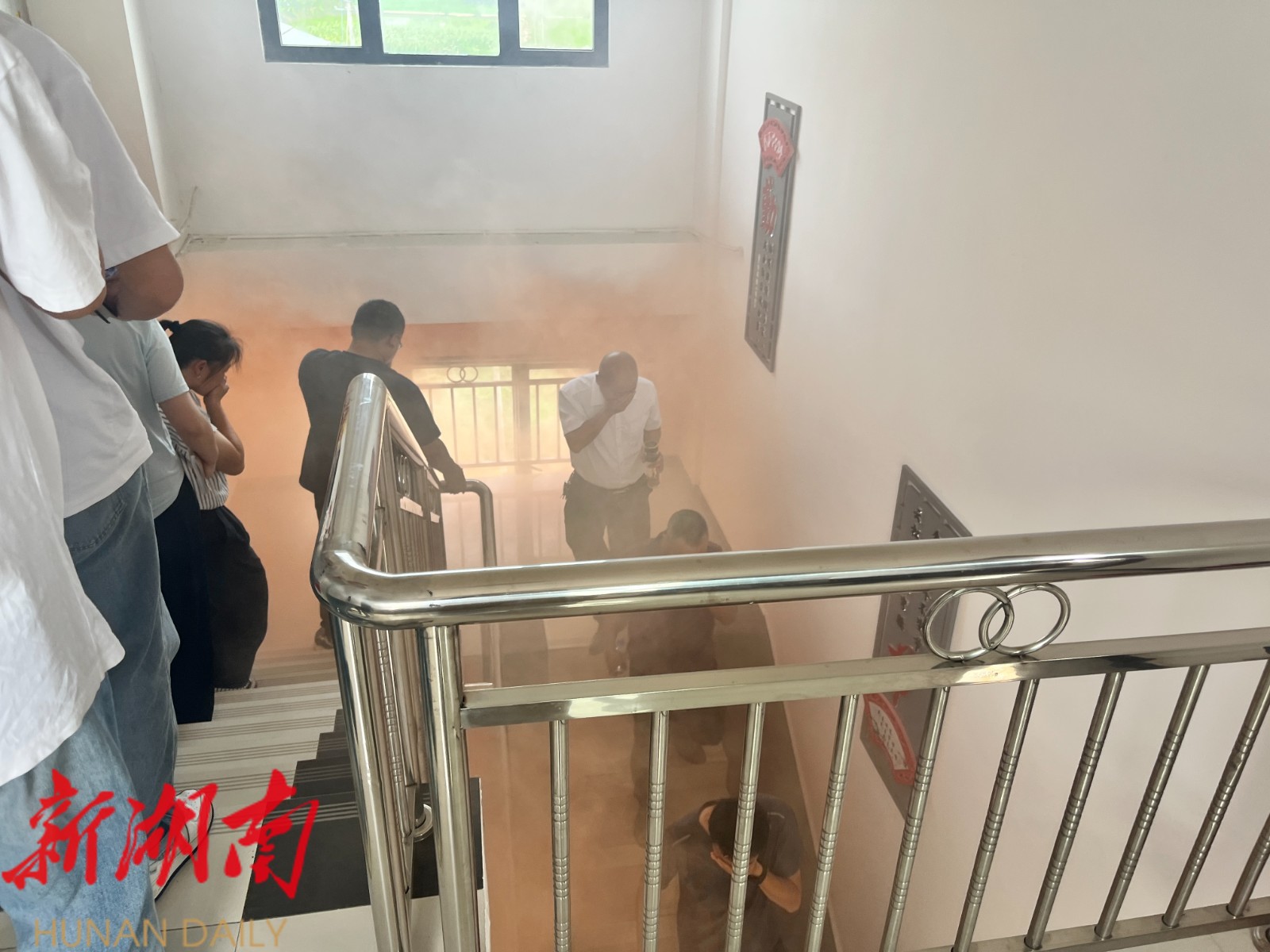 “起火啦!”随着烟雾演习地点起火点飘出,应急疏散逃生演练正式开始。全体人员在安全员的引导下,迅速用湿毛巾捂住口鼻,弯腰低姿,沿着预定的疏散路线,快速、有序地撤离至安全集合点。镇消防队员快速抵达现场,利用消防栓完成灭火救援。