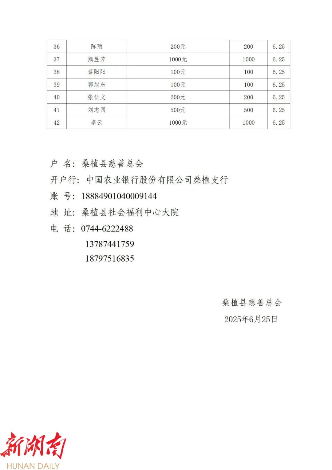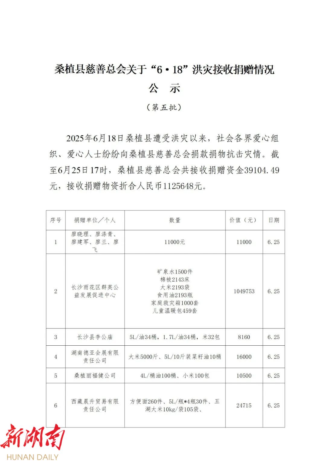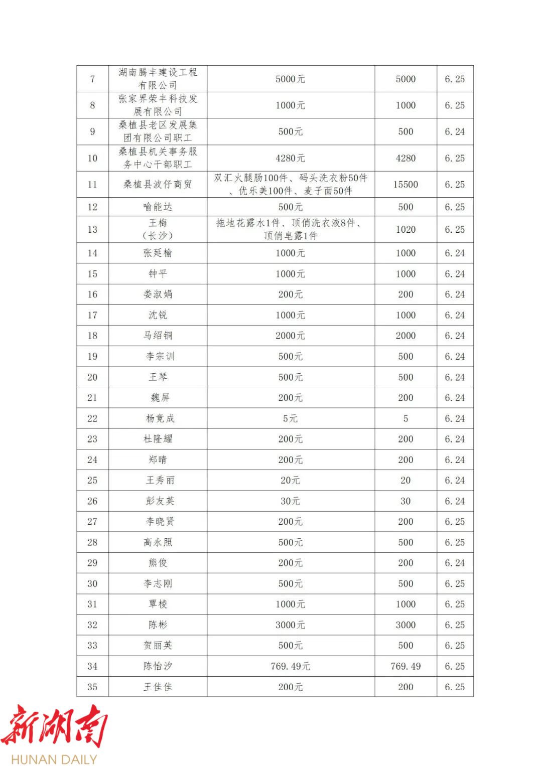 桑植县慈善总会关于“6·18”洪灾接收捐赠情况公示