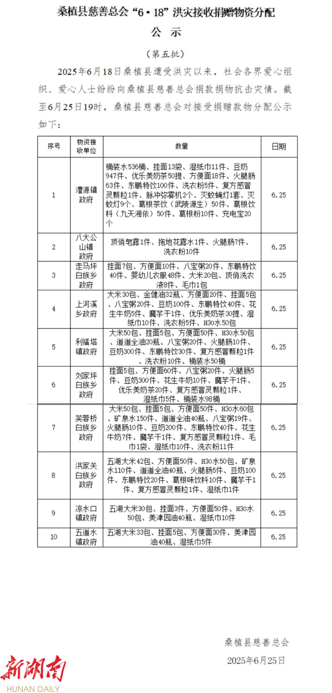 桑植县慈善总会“6·18”洪灾接收捐赠物资分配公示