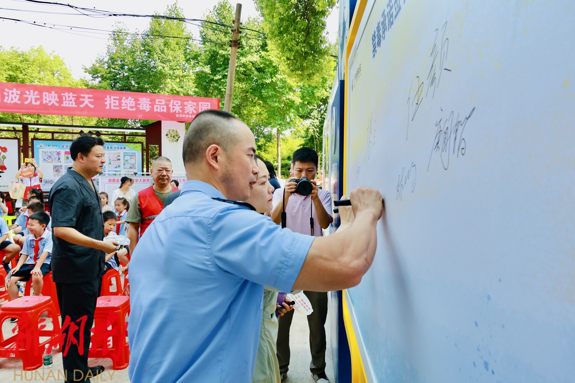 活动中,金庭学校学生代表发言,以青少年的视角,分享了其在学校、家庭和社会中学习到的禁毒知识以及观察到的潜在风险,并结合未成年人保护教育,谈及了提升自我保护意识、防范不法侵害的重要性。同时呼吁青少年要时刻保持警惕,增强自我保护意识,勇敢拒绝任何形式的侵害。随后,在窑湾街道鲁班殿社区党总支书记吴平正的带领下,全体人员肃立宣誓,向毒品宣战,庄严承诺参与禁毒人民战争。宣誓后,大家在“健康人生,绿色无毒”签名墙郑重签名,示范引领识毒防毒拒毒行动。