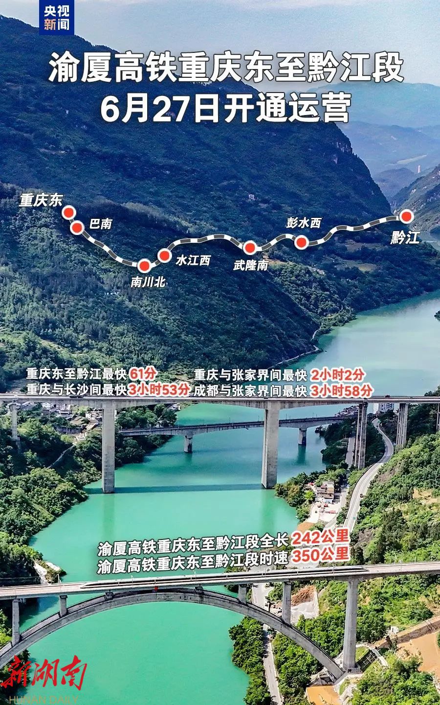 记者从国铁集团获悉,新建重庆至厦门高速铁路(以下简称渝厦高铁)重庆东至黔江段将于 6月27日开通运营, 渝厦高铁重庆东至长沙段全线贯通,重庆至长沙最快3小时53分可达 ,旅行时间大幅压缩,成渝地区双城经济圈 与长株潭城市群间联系更加紧密,将为沿线经济社会发展注入强劲动能。