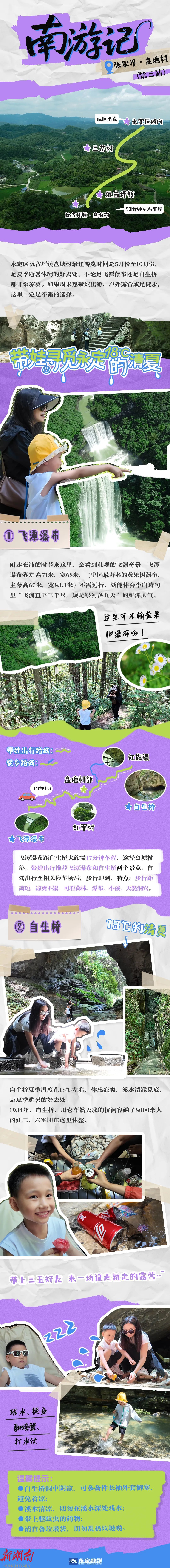 编者按:周末、假期不知道去哪玩?永定区的南线风景不容错过。这里可以感受天地灵宝的纯净,来一场与自然的约会;可以触摸千年前的肌理,来一场与时空的对话;可以体验农耕时代的文明,来一场归园田居的野趣……当我们加快脚步为生活步履不停负重前行的时候,也请记得,放慢脚步感受万物也是生活的一部分……永定融媒联合张家界天旅投公司推出《南游记》 系列视频,带您实地感受永定南线的山明水秀,寻幽探胜那些足够惊艳的旖旎风光,为您的假期出游提供多一项选择。今天推出第三期《南游记丨带娃寻觅永定18℃的清夏——盘塘村》