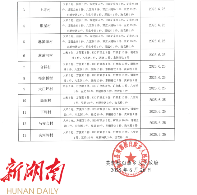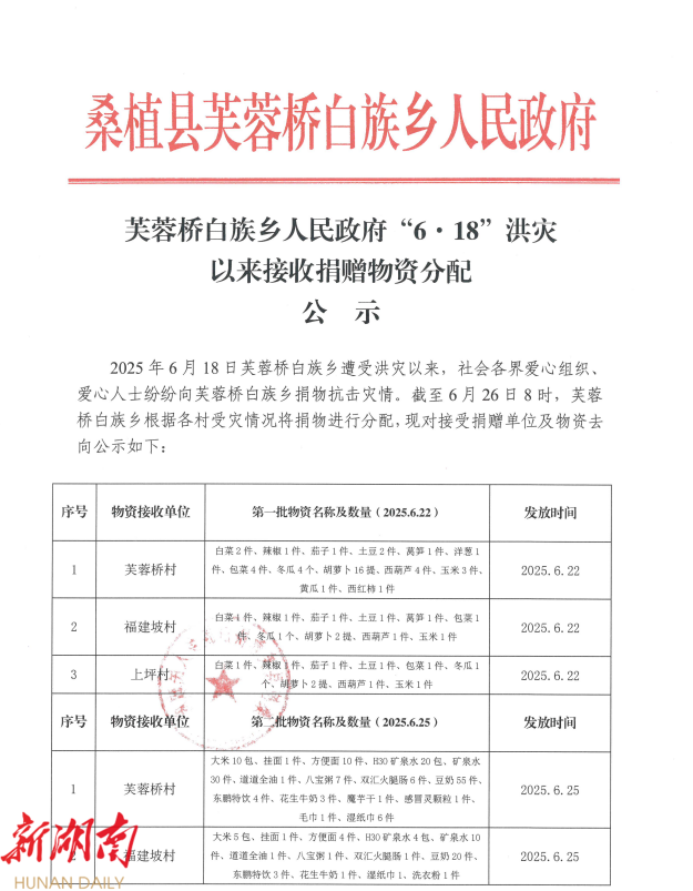 芙蓉桥白族乡人民政府“6·18”洪灾以来接收捐赠物资分配公示