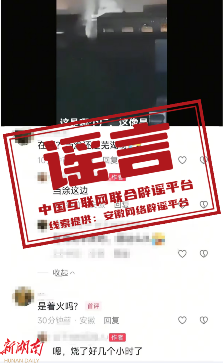 真相: 近日,一网民在短视频平台发布视频配文“这是哪个厂,好像是着火啦”,并在评论区称“工厂在当涂、烧了好几个小时”等。经安徽省马鞍山市当涂经济开发区应急管理局和消防救援中心核实,当涂经济开发区境内没有发生火情火灾,该视频为虚假信息。(来源:“安徽省互联网违法和不良信息举报”微信公众号)