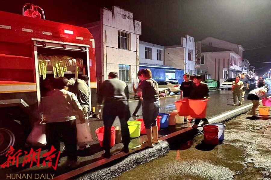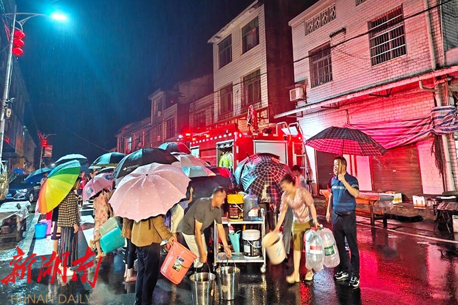 深夜时分,雨水仍淅淅沥沥。在夷望溪镇兴隆社区街道上,消防车闪烁的红光穿透雨幕,镇村干部早已忙碌开来:有人熟练连接输水软管,有人仔细调试水压,还有人贴心搀扶老人排队接水……居民们手持水桶、塑料壶等储水工具,有序排起长队,和彩色雨伞一起在夜色中交织成独特风景。
