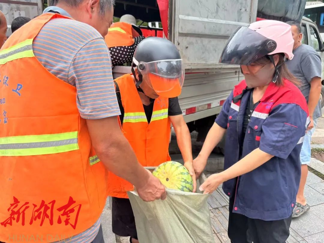 湖南日报·新湖南客户端6月27日讯(通讯员: 刘静)洪水退去,面对街道留下的破碎包装袋、泡烂生活用品、散落树枝杂物等各类垃圾,环卫部门迅速行动,分路段开展清理工作,默默修复着家园的容貌。6月27日,廖家村镇莫家塔村的西瓜种植户载着300个西瓜来到了环卫工人街景广场驿站,向这群默默奉献的“城市美容师”表达敬意与关怀。