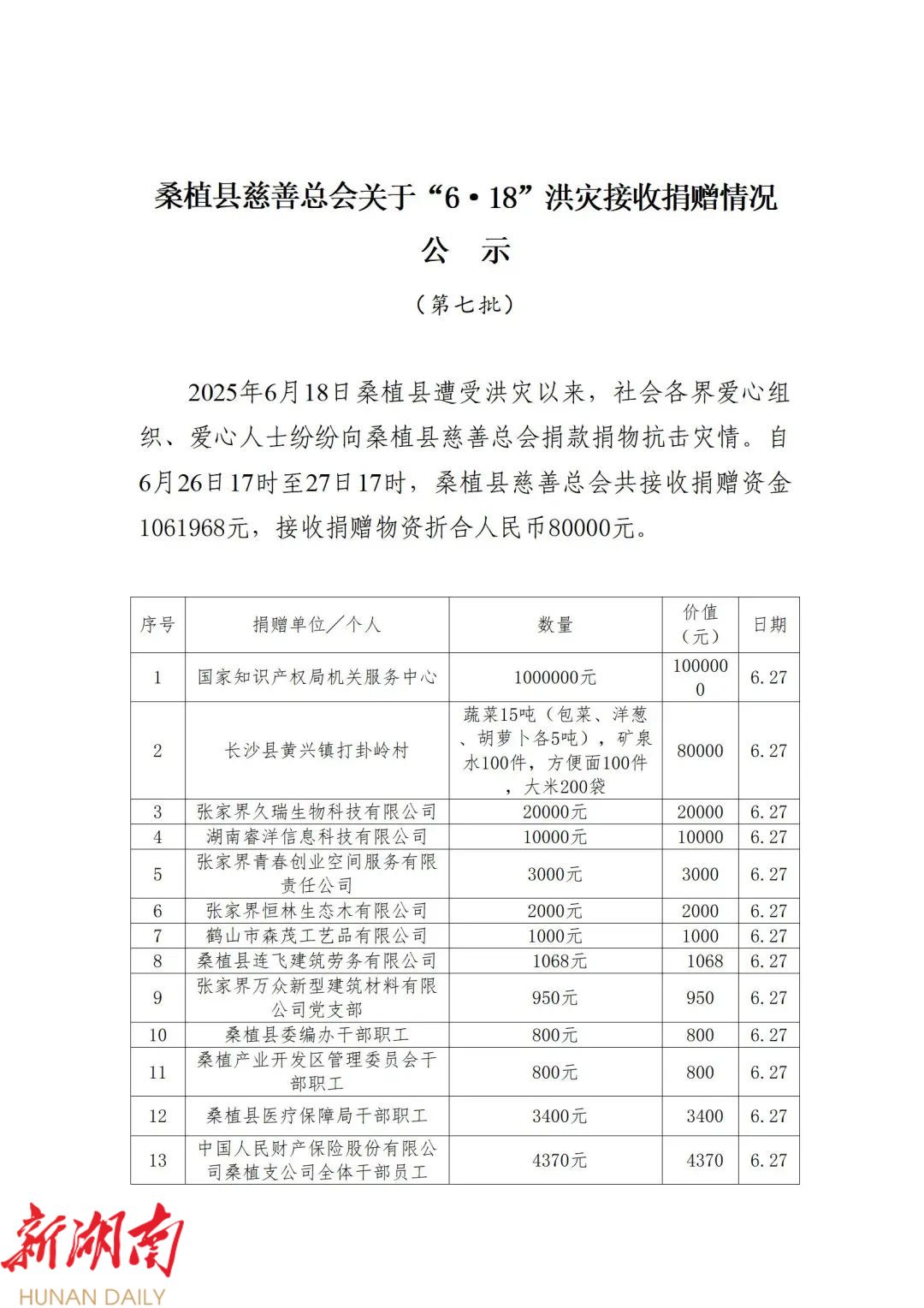桑植县慈善总会关于“6·18”洪灾接收捐赠情况公示